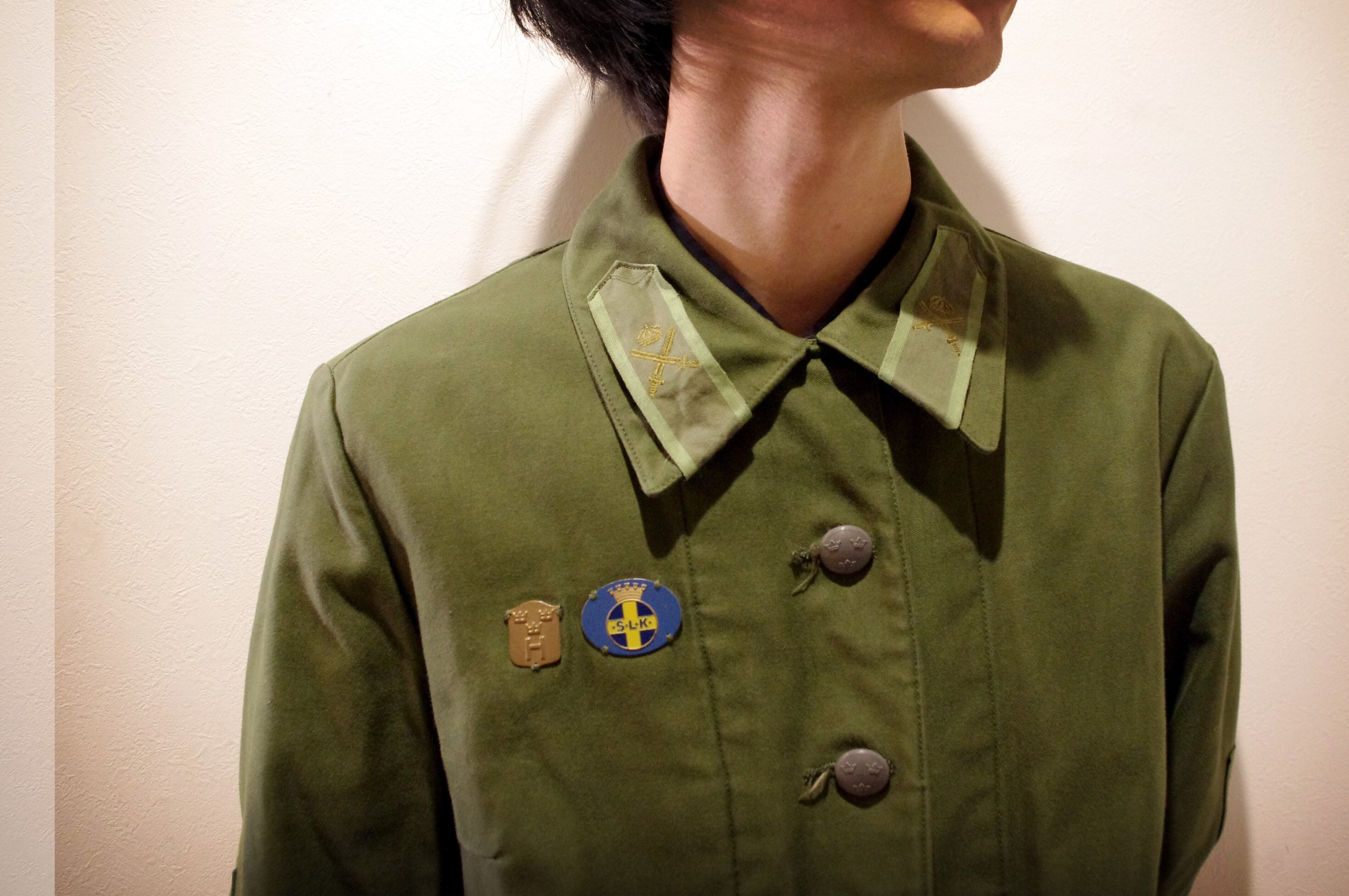 スウェーデン軍のM59コンバットジャケットです。王冠マークが3つ入ったボタンに、襟には剣のエンブレム。胸元には国旗のアクセサリーもつけられ、ミリタリーの機能性も生かされたデザインが、ワンランク上の大人で上品、でもヴィンテージ感溢れるスタイリングを演出させます。