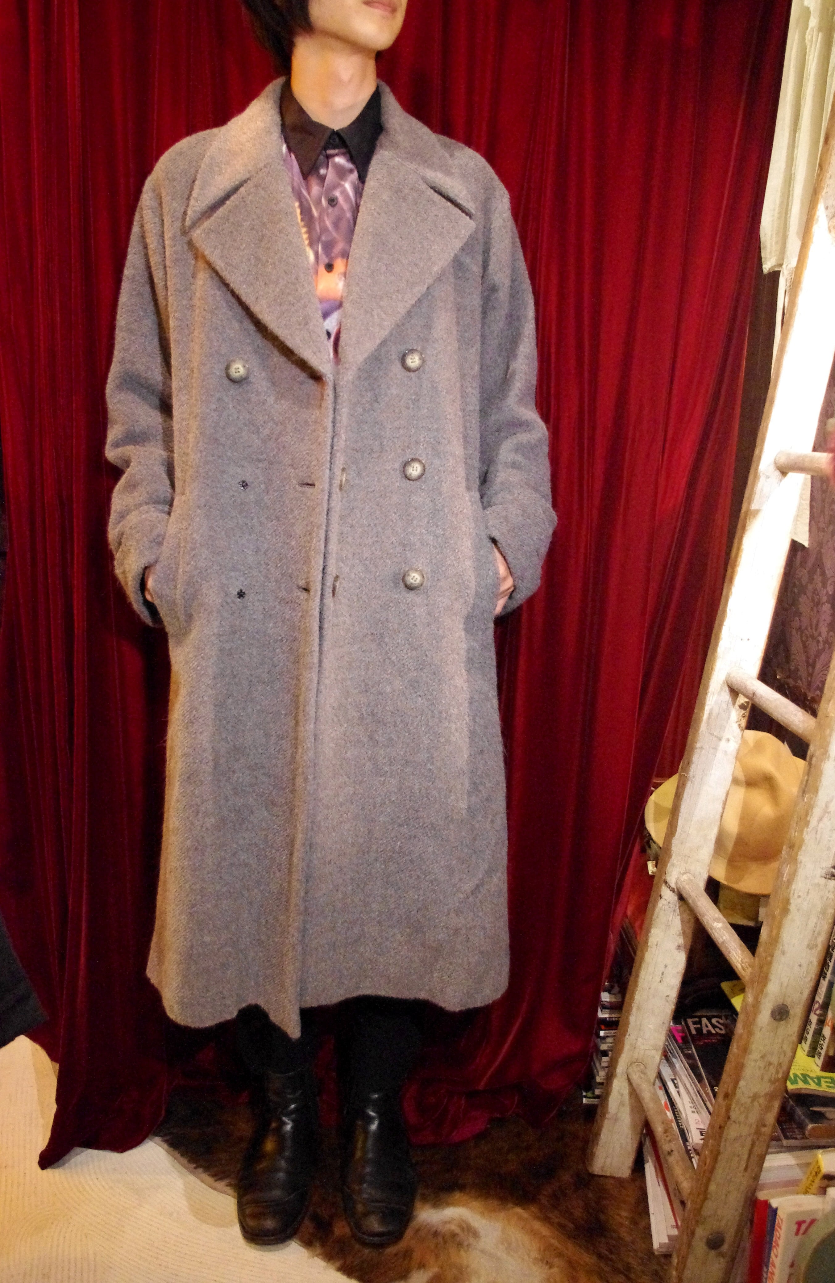 柔らかいグレーの色がエキゾチックなこちらはKarl Lagerfeldのチェスターコート。迫力あるオーバーなサイズ感と、ドルマンスリーブが作る中性的なオーラ、また仕立ての美しさからストイックな拘りを感じる圧倒的な存在感のスペシャルな一着。