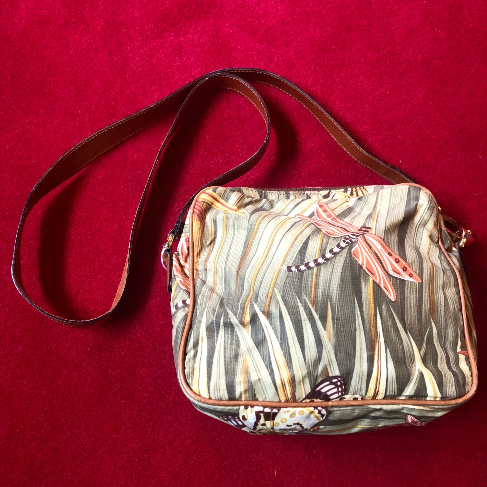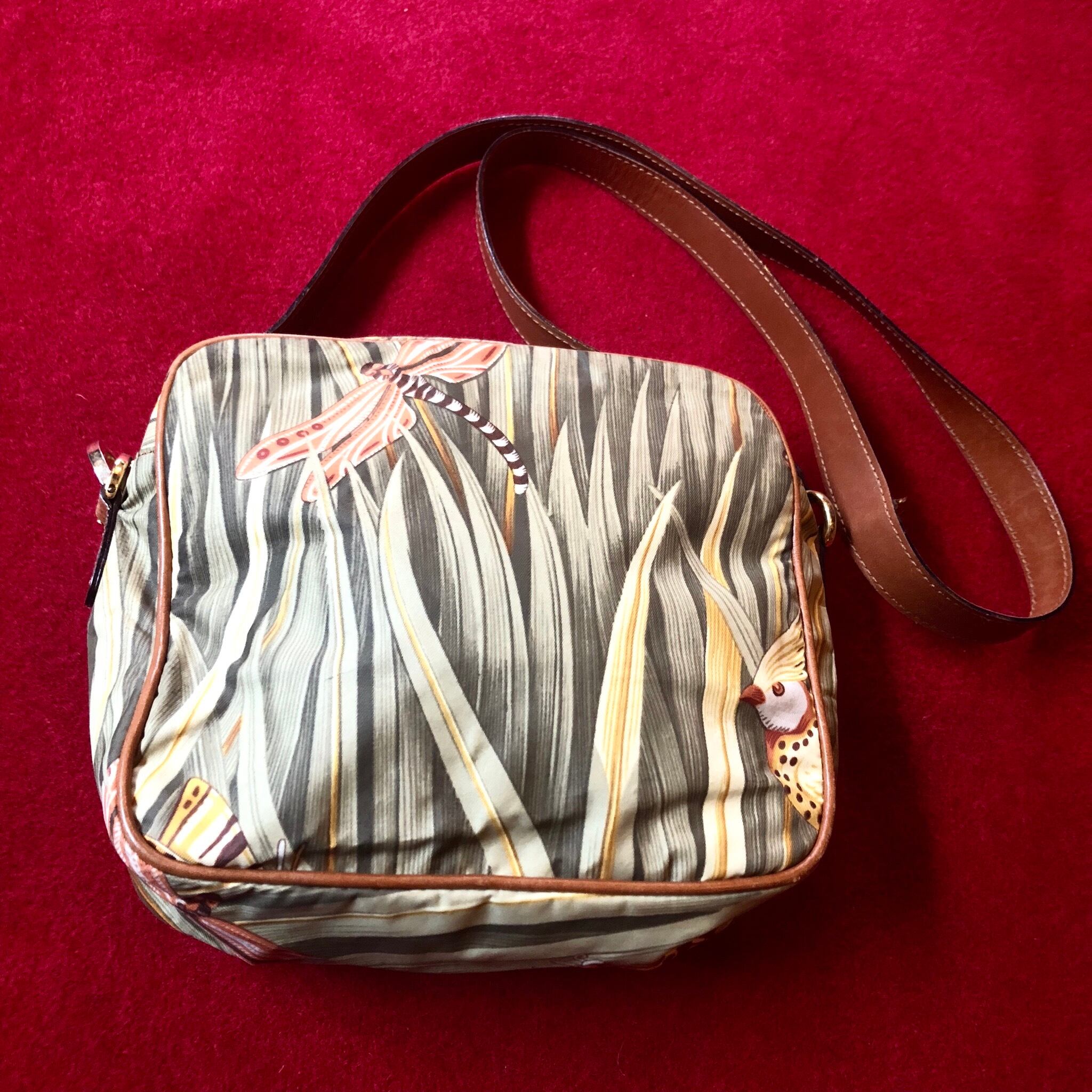 80年代らしい動物や植物の総柄のショルダーバッグは「Salvatore Ferragamo」のもの。
