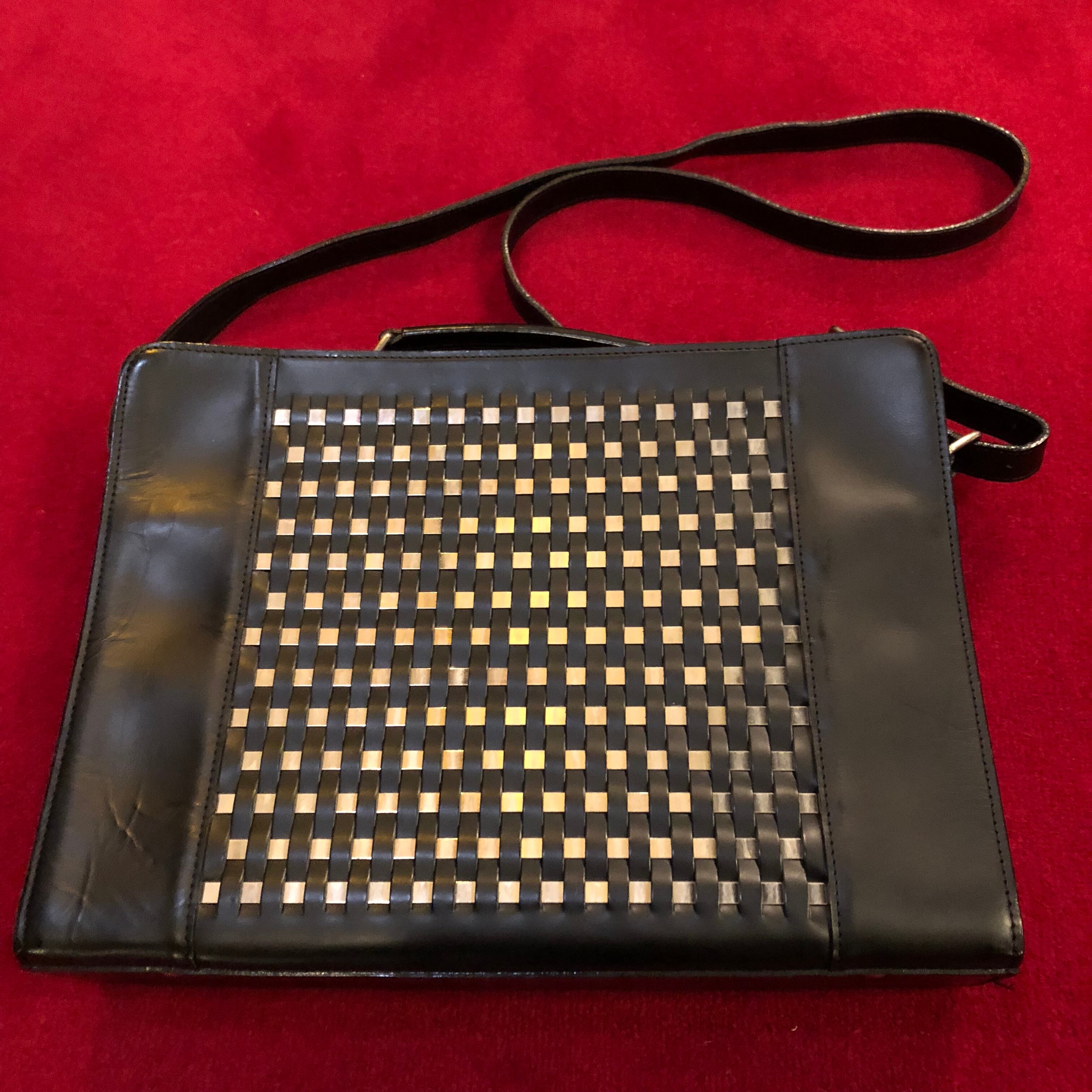 お得意の合皮にメタルプレートが編み込まれたレザーのスクエアショルダーバッグ。