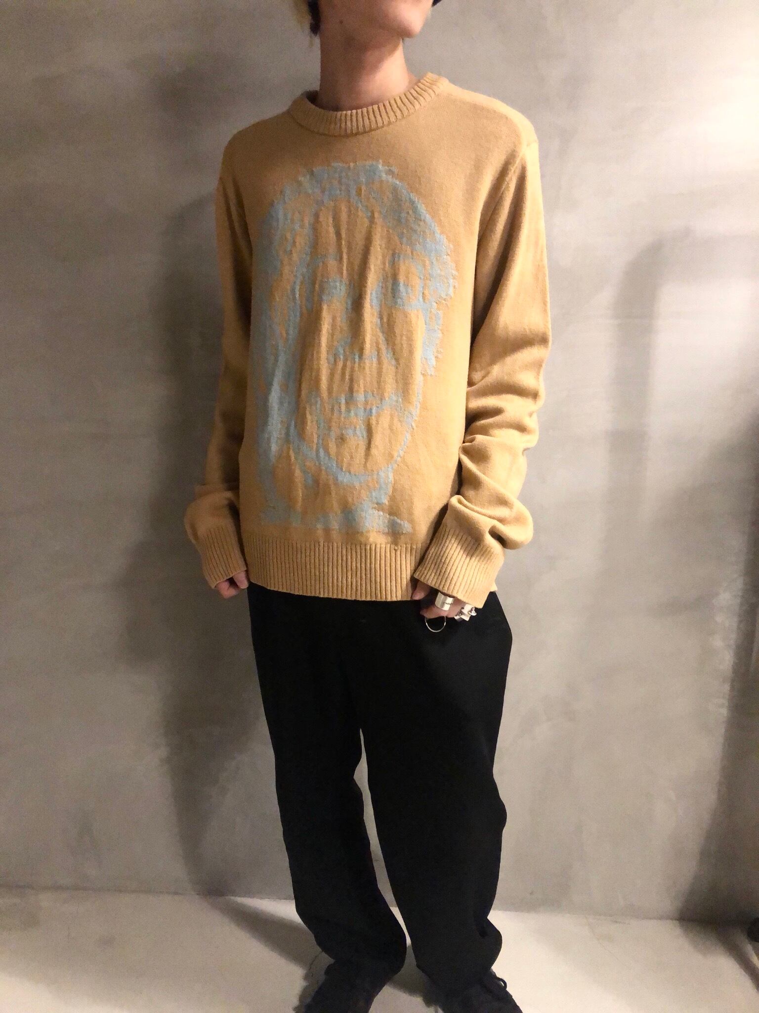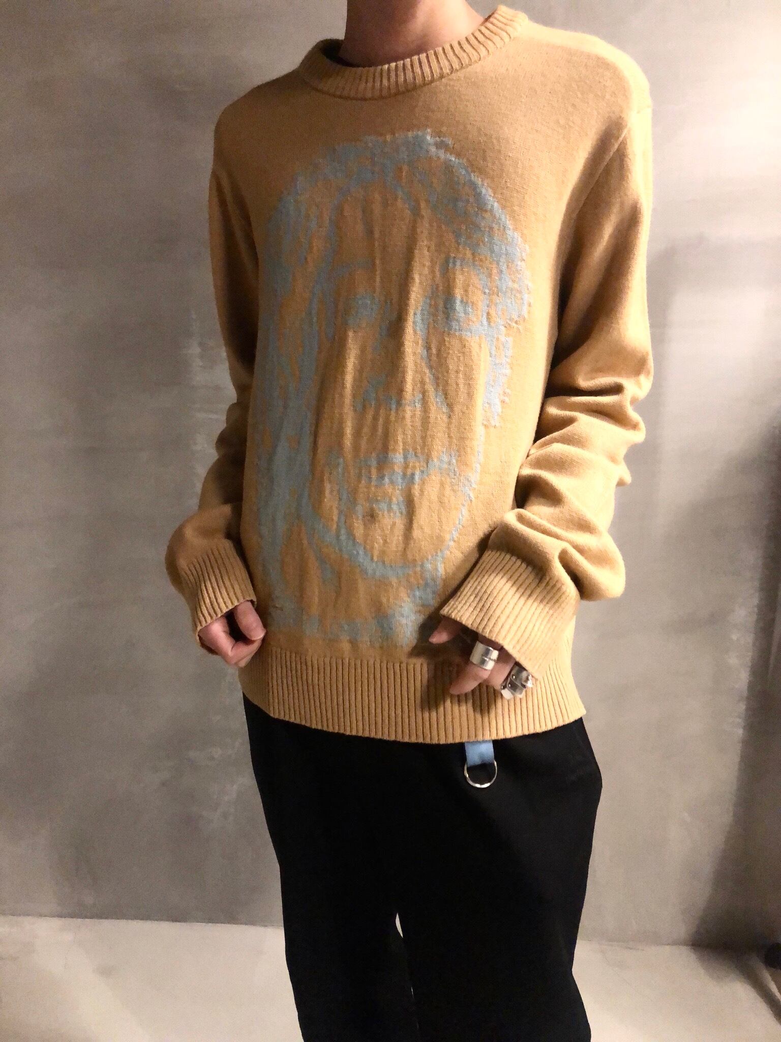 ベージュカラーに人の顔が浮かび上がる少し怪しげなニットセーター。