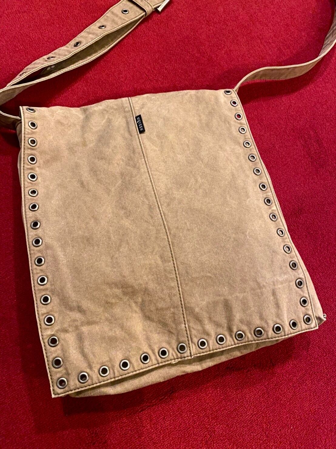 整列されたハトメ使いが印象的なアレキサンダーマックイーンのショルダーバッグ。