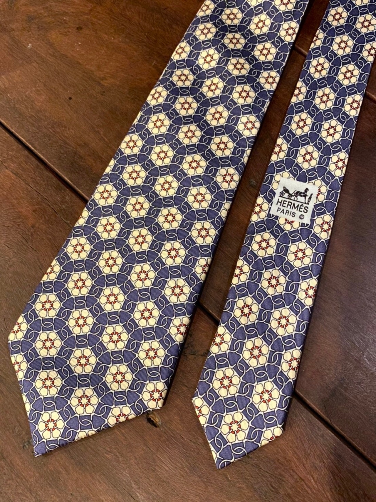 どこか小紋柄のような細かな花の柄が、幾何学に散りばめられたHERMESのシルクネクタイです。