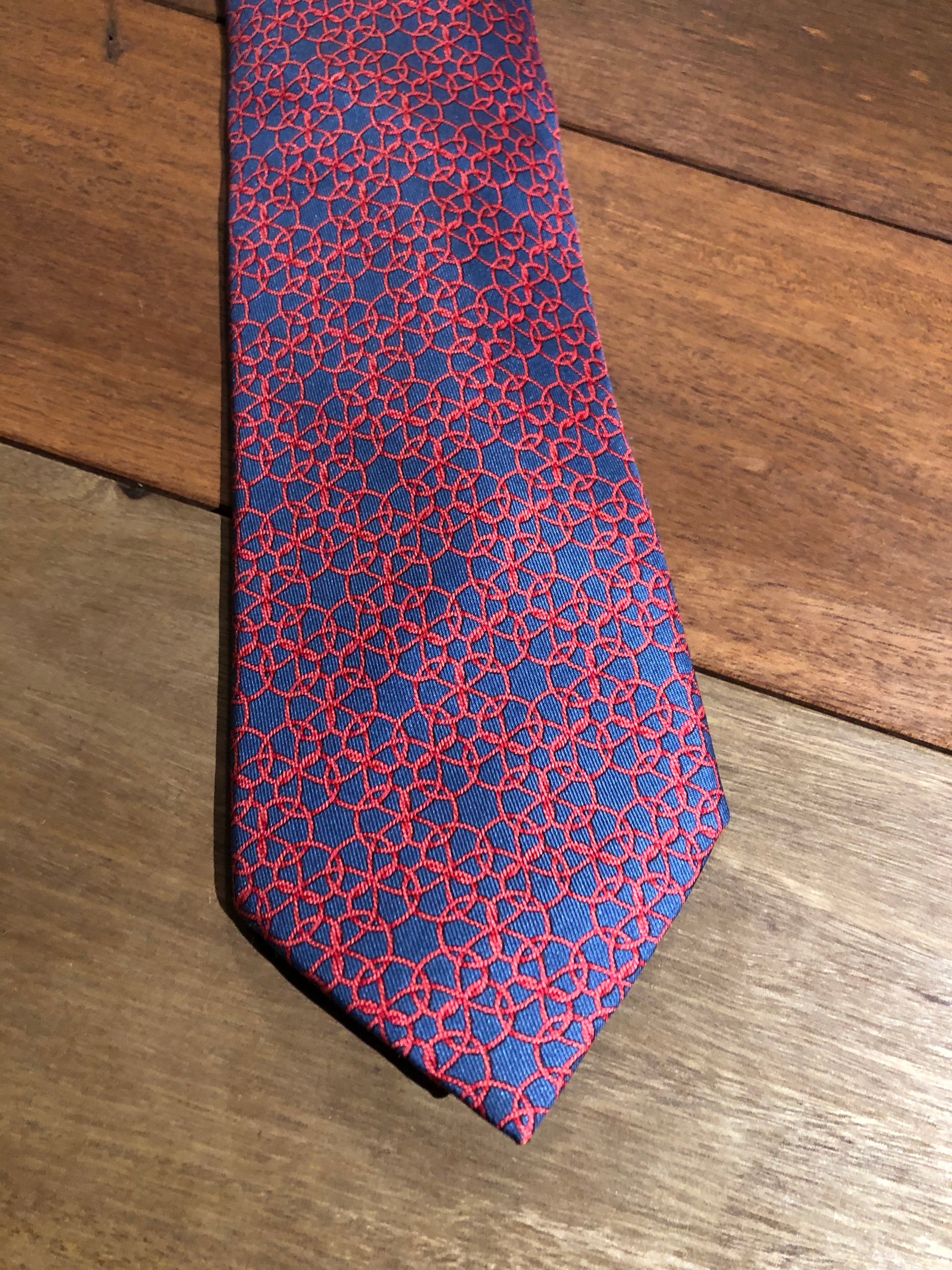 縄がループで連なり幾何学に散りばめられたHERMESのシルクネクタイです。