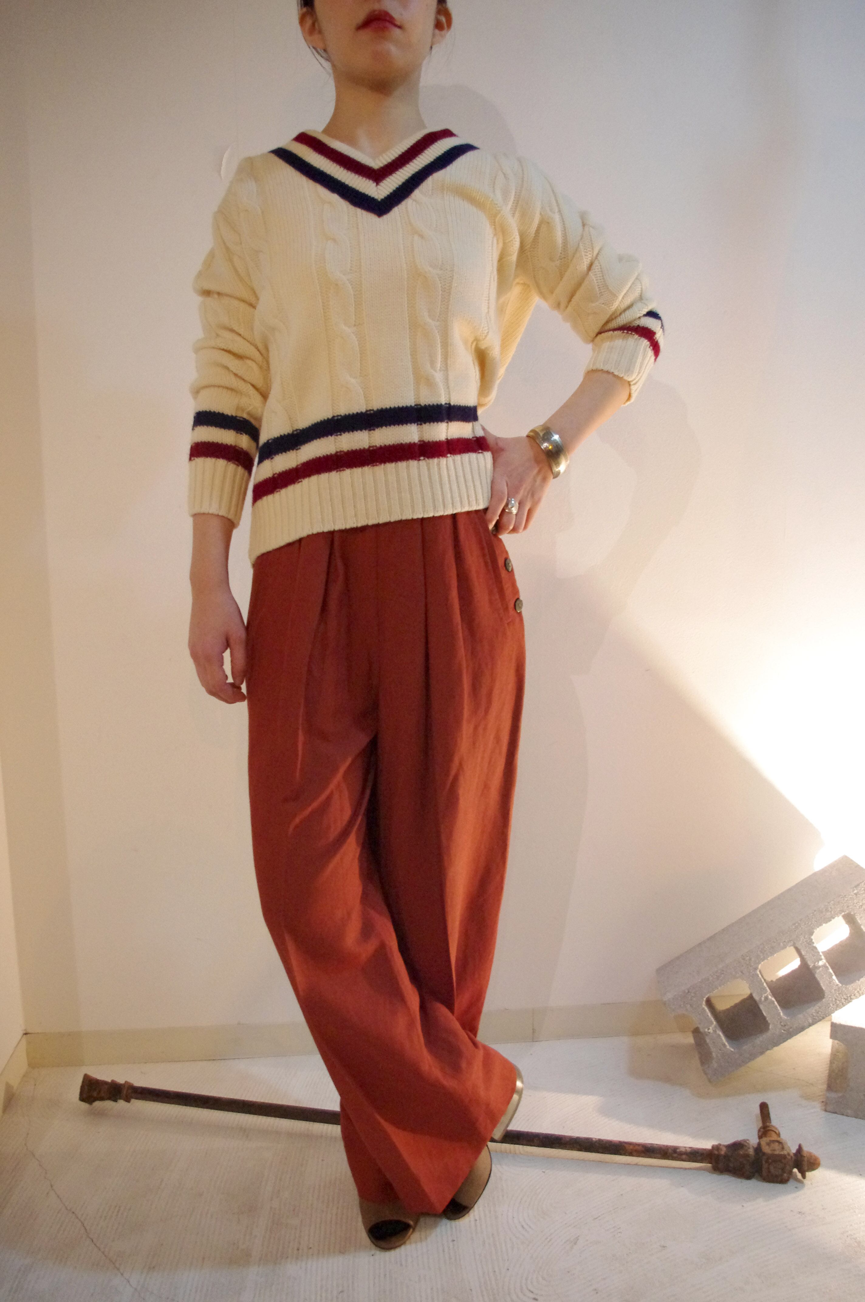 タンジェリンオレンジのクラシカルなカラーリングが小粋なタックワイドパンツ。vintageならではの小慣れた感を作り出してくれるオーバーなハイウエストと、ウエストに縦に並ぶマーブル模様のボタンがキュートで現代ではお目にかかれないハイセンスなディテイル。ヒールをmixする事で今年らしいマニッシュかつマスキュリンなstyleに。