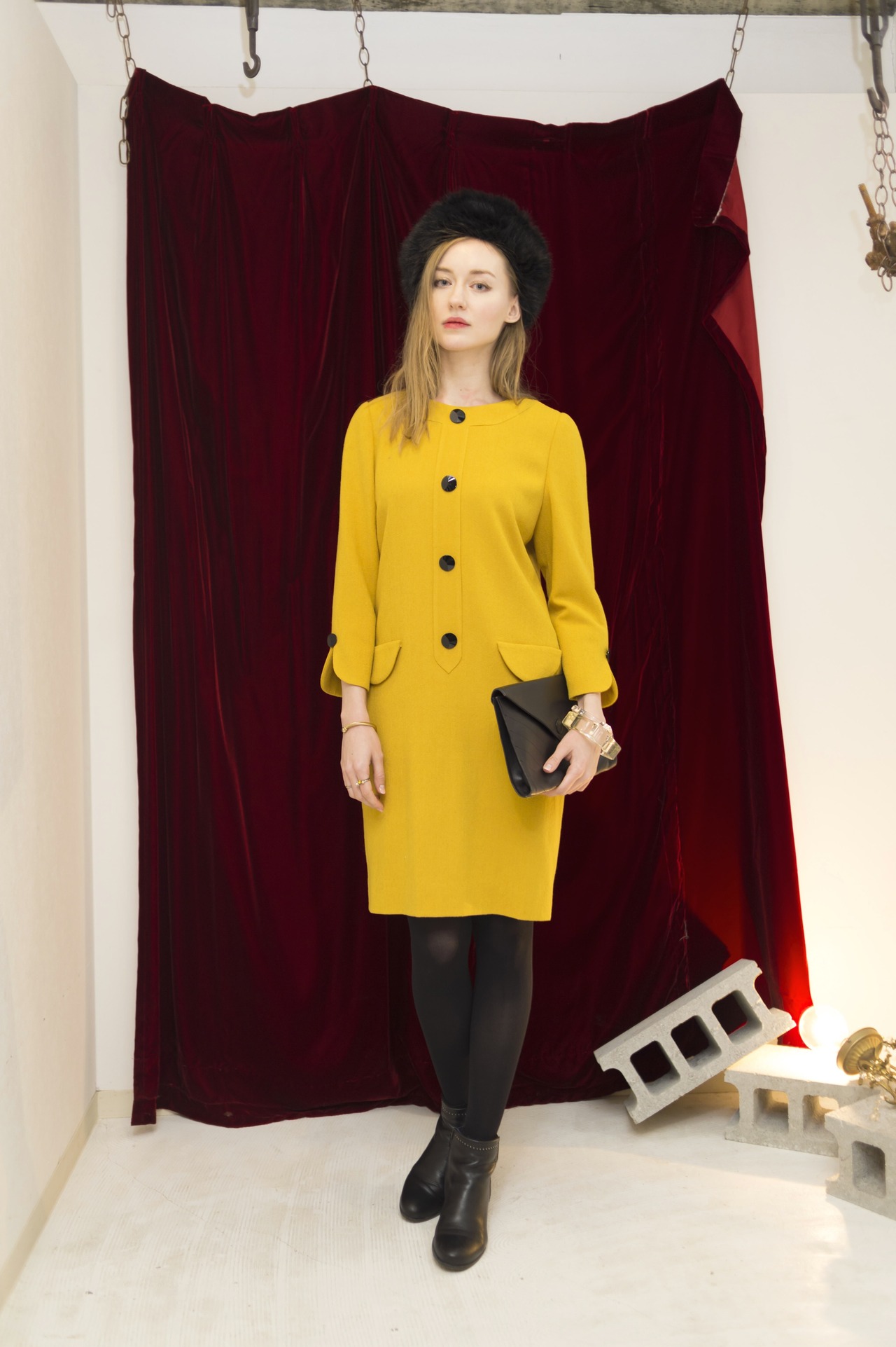 60年代のファッション界の帝王、Pierre cardinそのものといえるデザイン。1964年のスペースエイジというシーズンが有名で、その時を彷彿とさせるようなワンピースです。得意のビッグディテイル、フェイクポケット、バイカラーを用いた見るものを楽しませるクリエーション力の強さ。どれを取っても申し分のない、ため息の出るようなコレクション級の名品と呼べるアイテム。