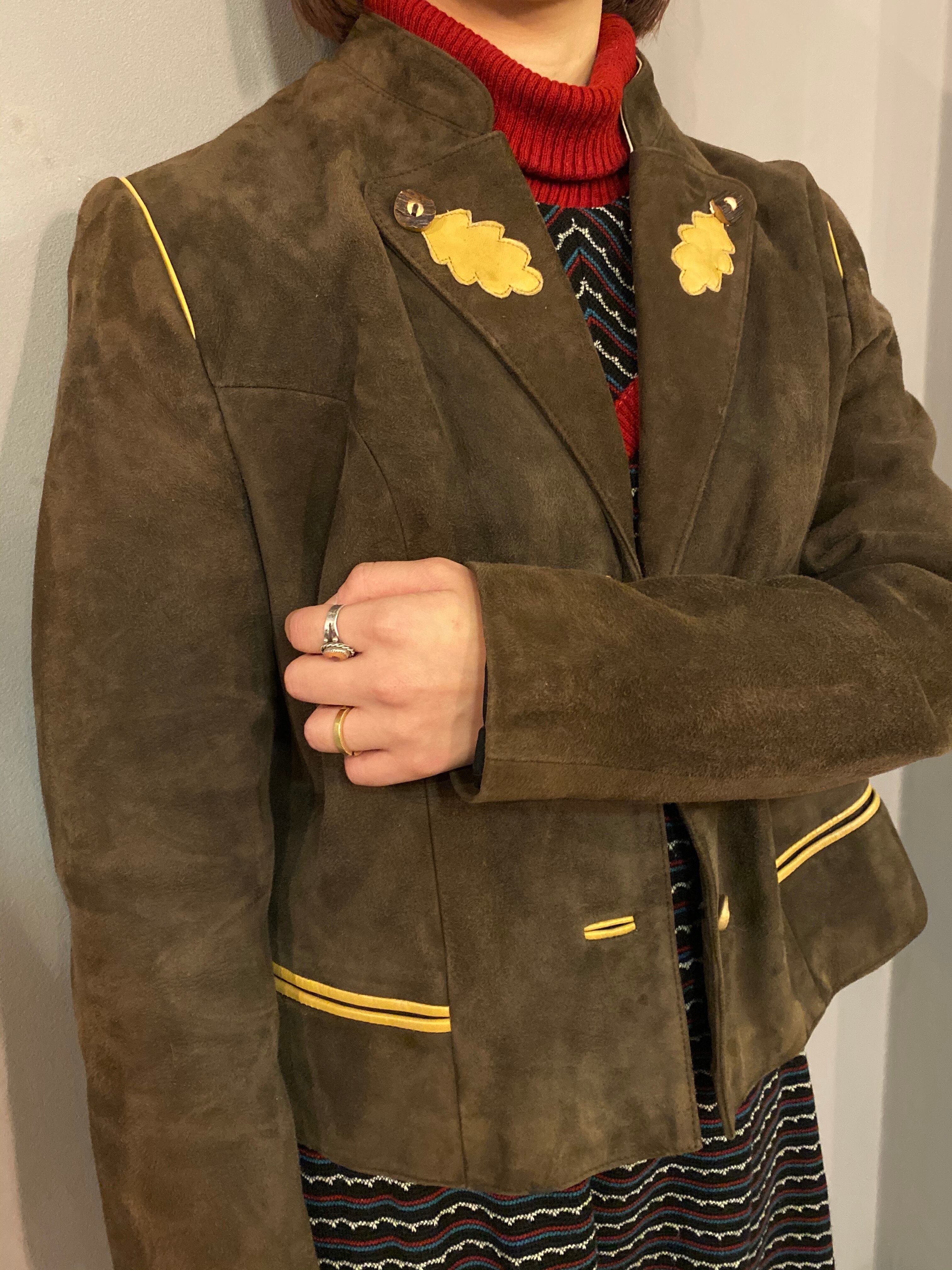 スエード素材のチョコレートブラウンカラーに、マスタードカラーのレザーパーツがエッジのきいたチロリアンジャケットをご紹介致します。