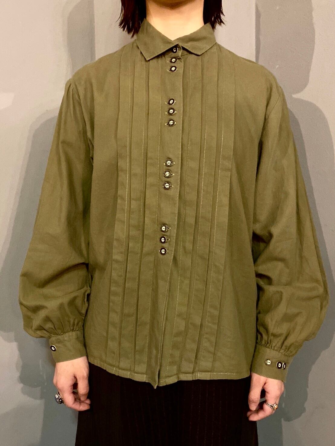 オリーブグリーンのコットン地に水牛ボタンが特徴的な、AUSTRIA tyrolean vintageのブラウスをご紹介致します。