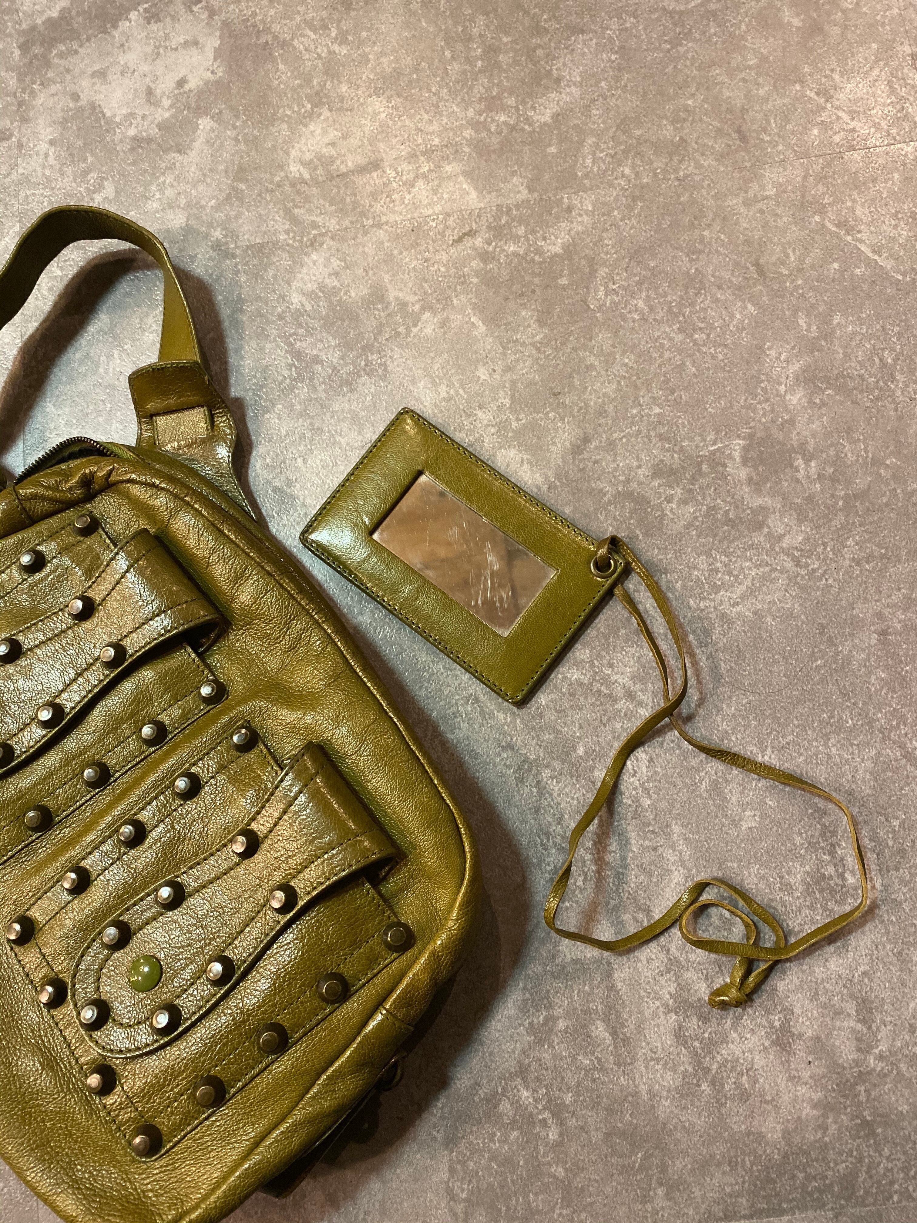 ミリタリー調なカーキグリーン×褐色のプリン型スタッズの組み合わせという強さを感じさせる男性的な要素と、カッティングの美しい曲線のポケットの屋根やレザーショルダーのパーツ&華奢な作りが女性的な要素の二面性がmixされた他にはない世界観と、クラフトマンシップを感じる一品。