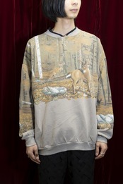鹿が森林に佇む情景が描かれた美しいスウェットトレーナー。前後袖にまで描かれ、2重のリブやシームポケットなどディティールにも凝ったデザインが盛り込まれております。