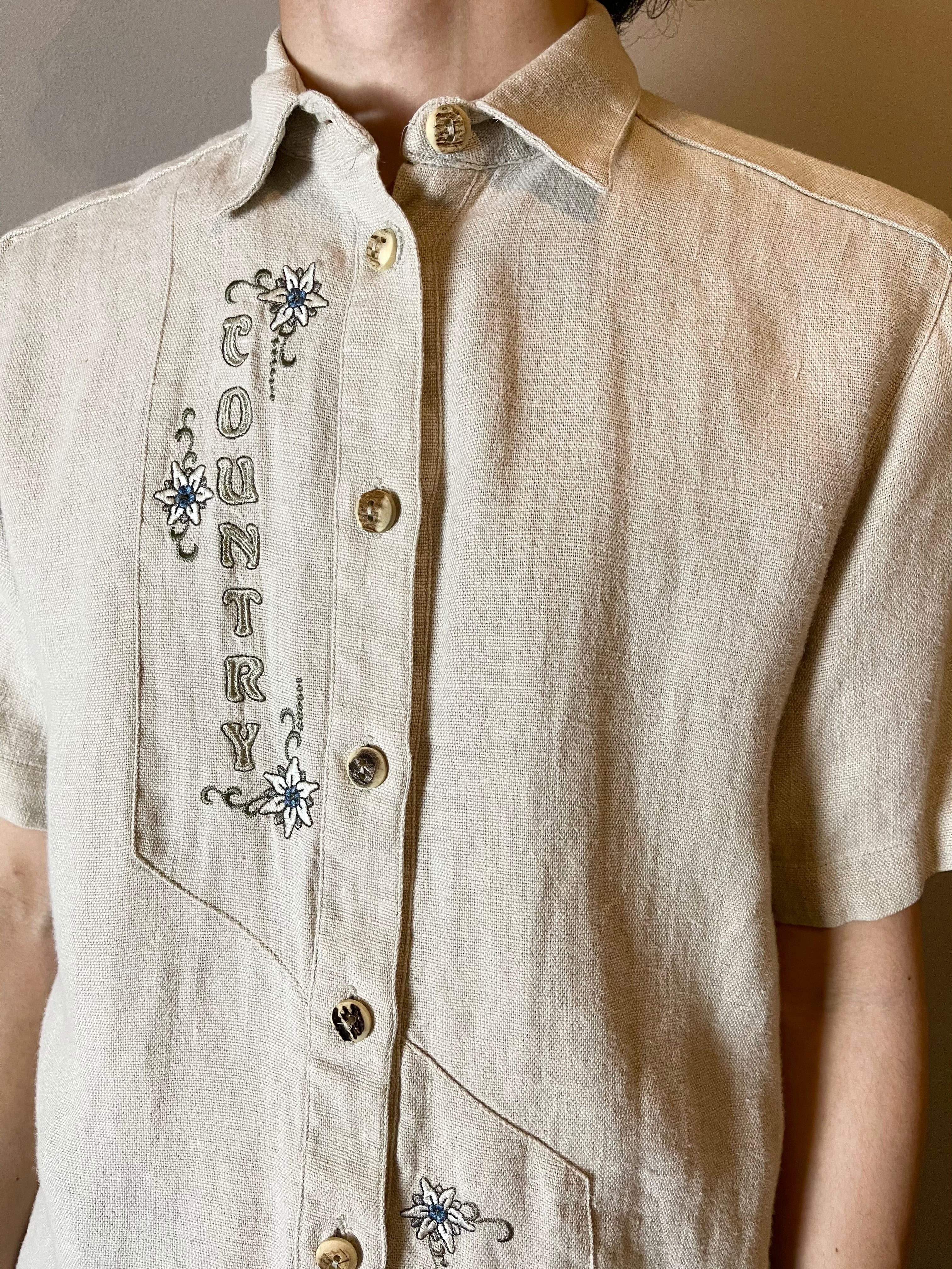 リネン混で夏に嬉しい半袖のチロリアンシャツをご紹介します。