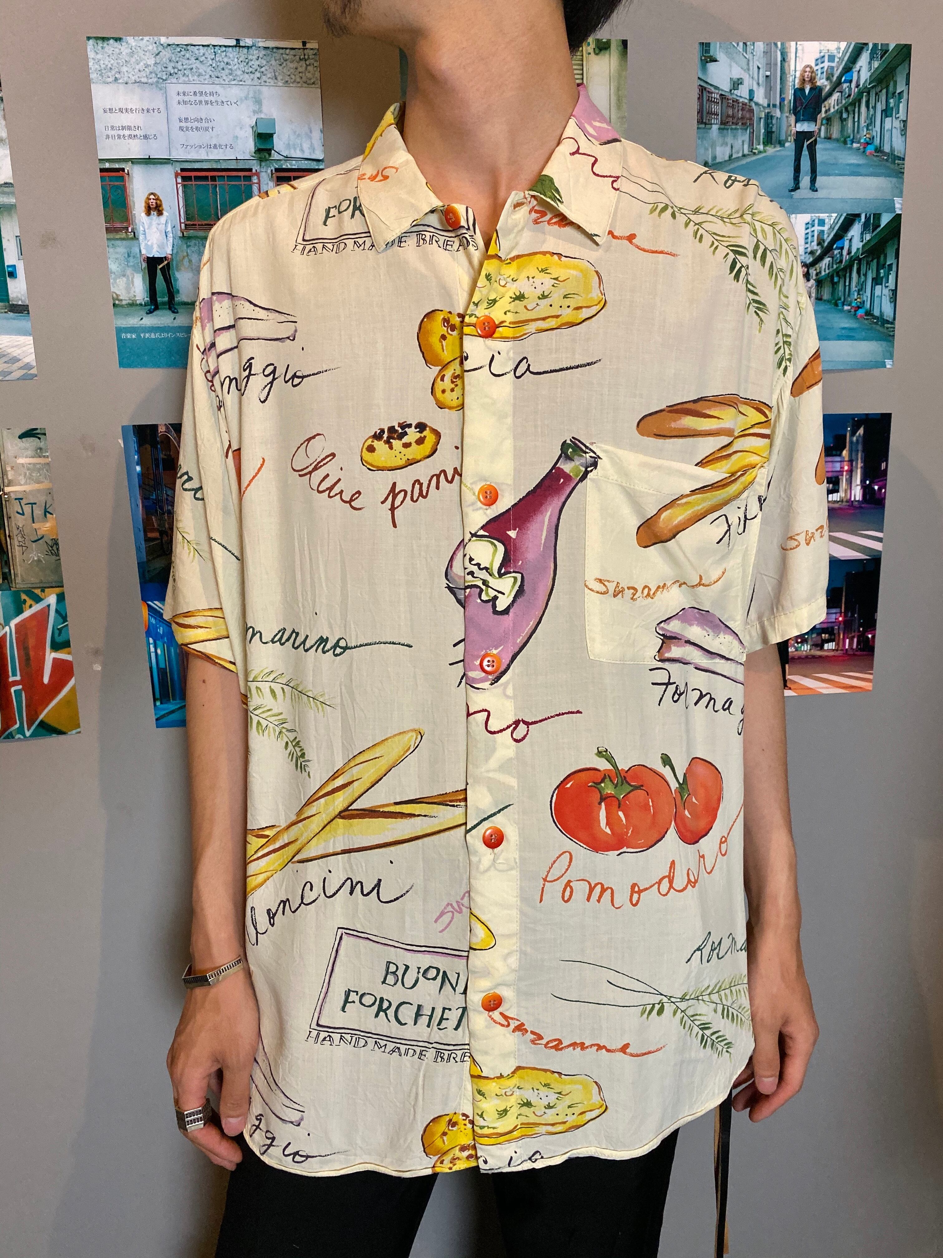 アイボリーの身生地にポップな食べ物の総柄プリントが映える半袖シャツをご紹介します。