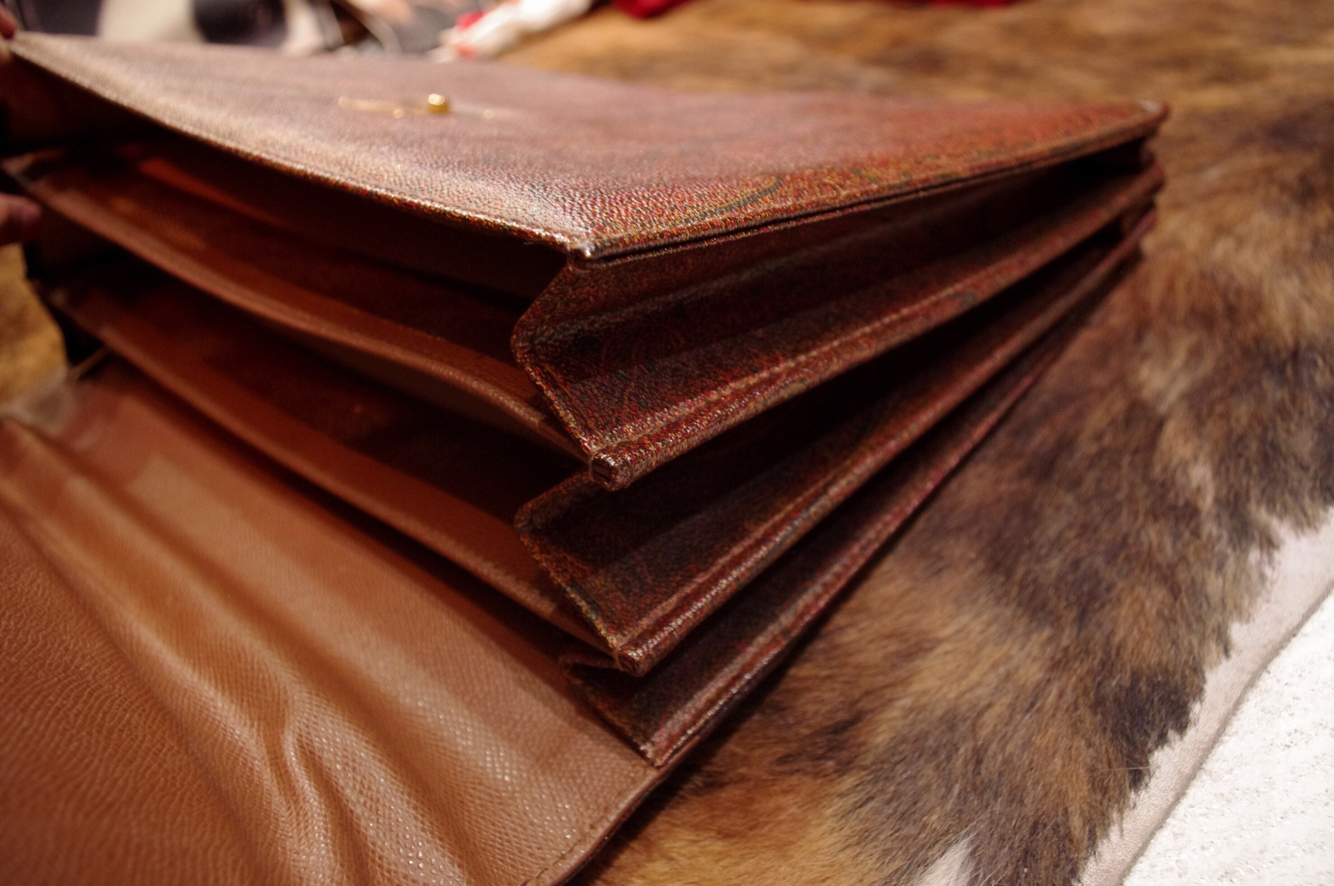 一緒に合わせたのは、シャツと同じくETROのバッグ。まるで洋画に出てくるようなアタッシュケース。ETROのアイコンデザインであるペイズリー柄をPVC加工素材に施してしまう所はまさにアヴァンギャルドの一言。癖のあるvintageマニアには堪らないアイテムです。