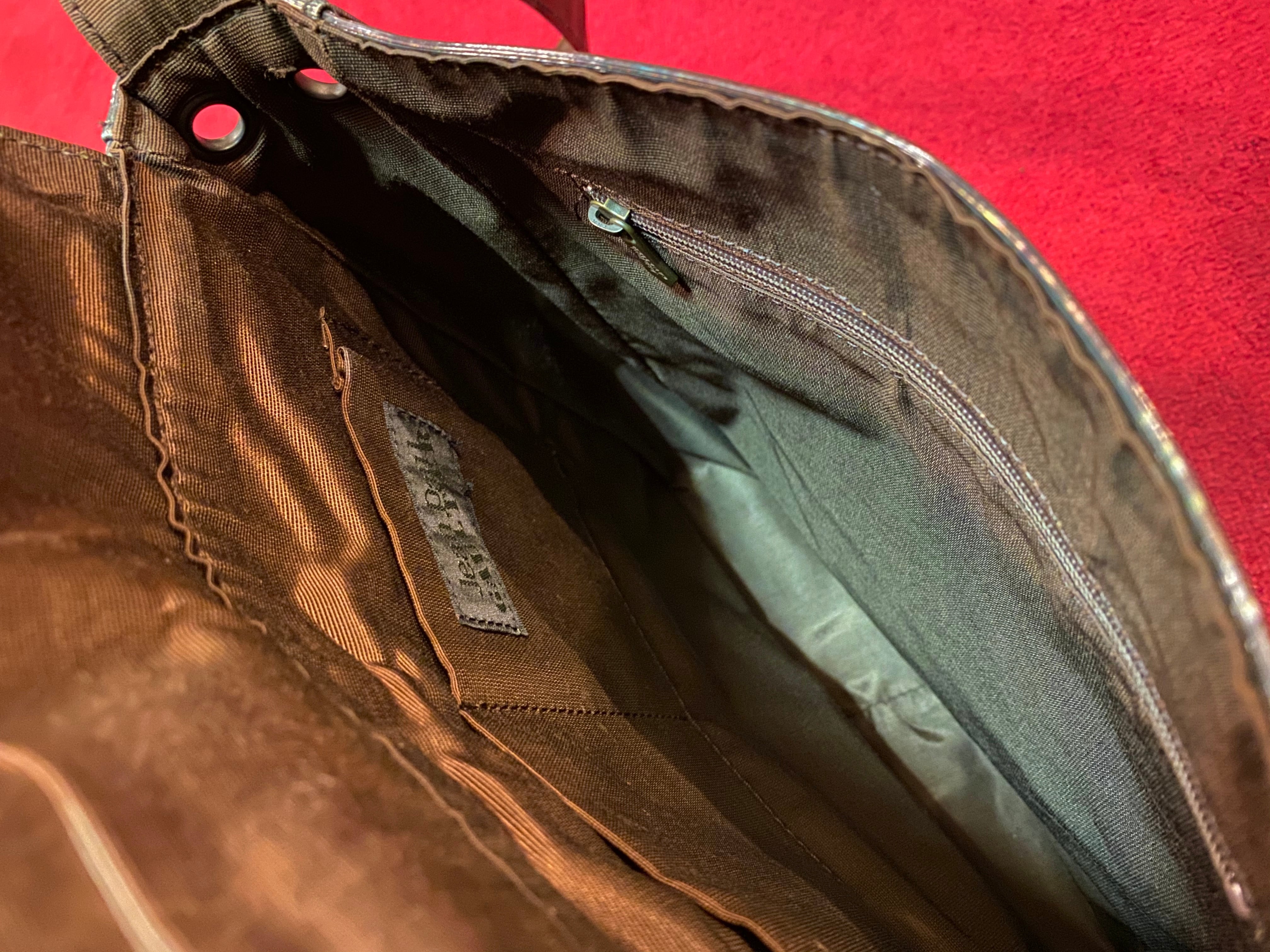ゴルチエのバッグというとサイバーシリーズという程人気も高く、緑を基調とした角度に寄って色の変わる不思議な色彩はインパクトがあり、オンリーなニュアンス。