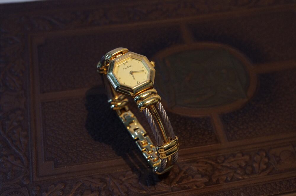 バイカラーのアクセサリー感覚でつけられるPierre Cardinの時計。