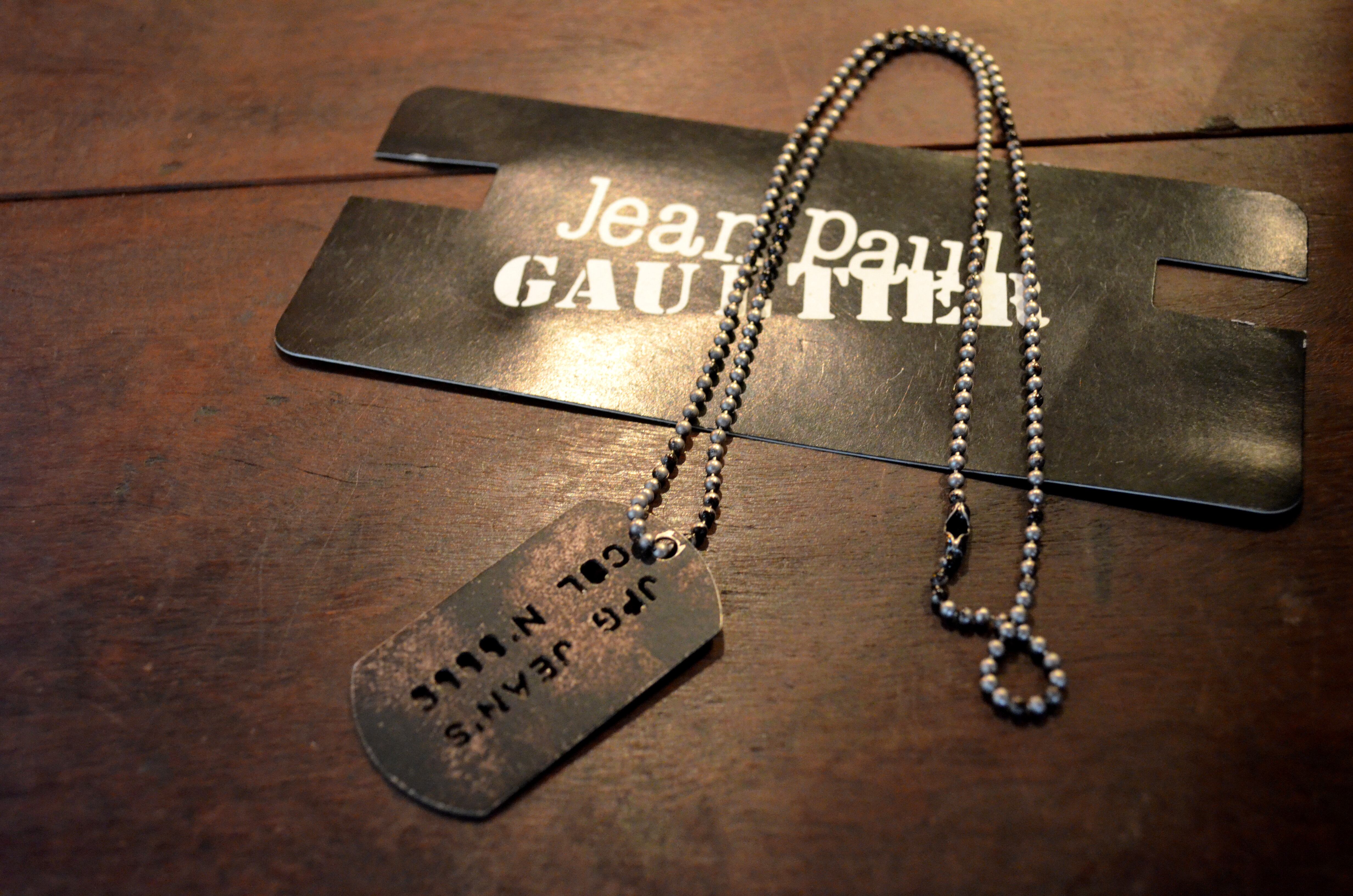 ヴィンテージ燻加工の施されたメタルプレートに、ゴルチエのロゴが彫られたドックタグ。ボールチェーンにまでムラのある燻加工を施した拘った希少な作品です。