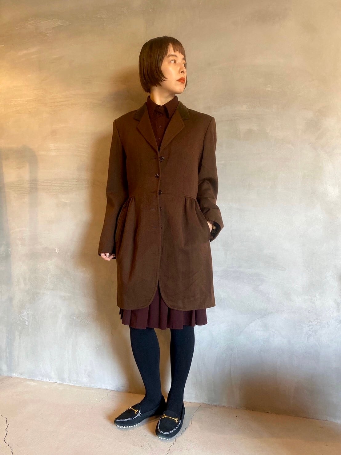 高めな襟には更にマットなブラウンのコーデュロイの切り替えをアクセントに、強めな肩のラインから絞られたウエストラインにはギャザーを入れて女性らしさを加味したギャップのあるデザインに。