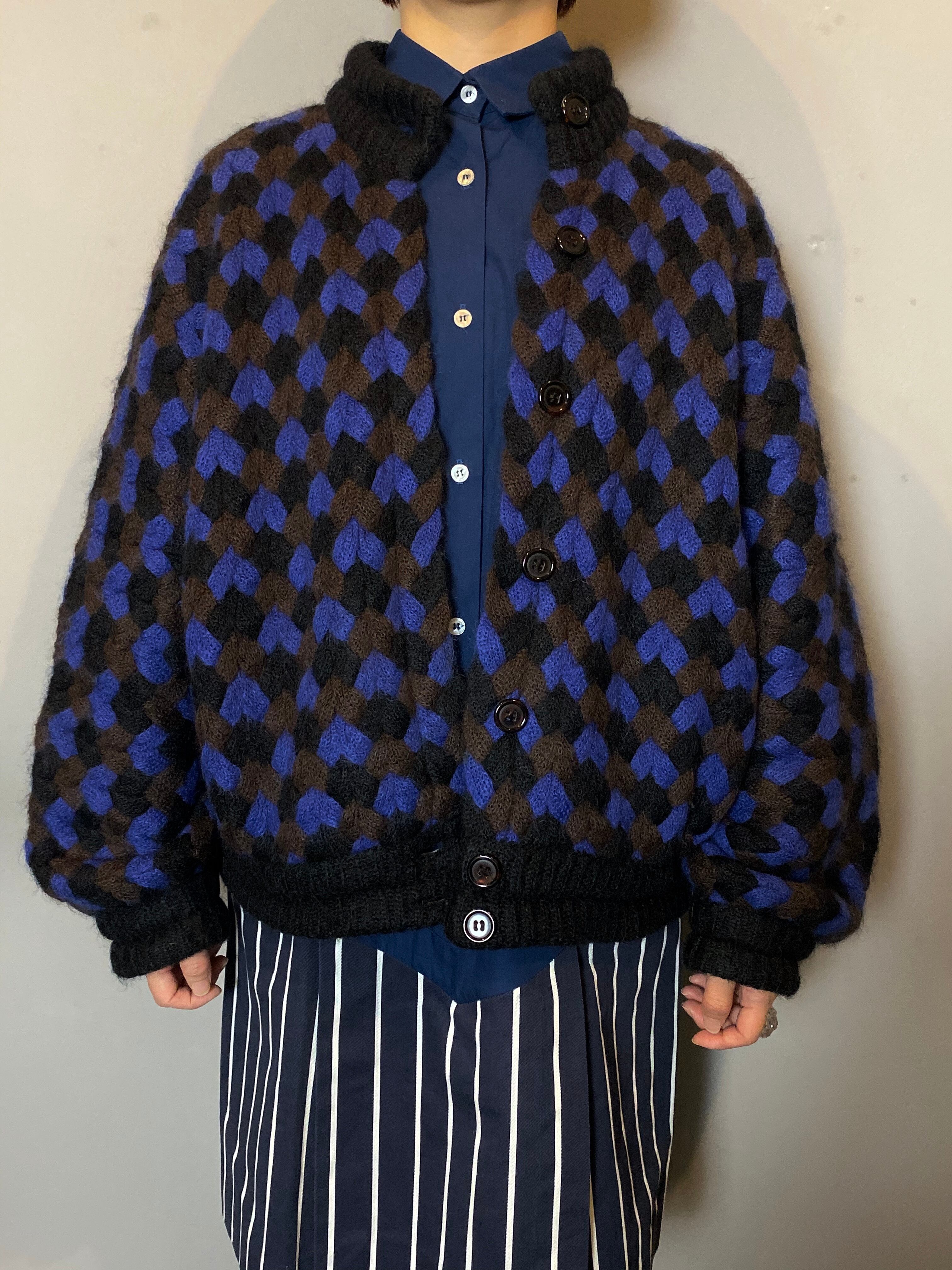3色の厚手の生地を編み込みそのまま柄にする事により、単色のケーブルニットとはまたワンランク上のニットに。