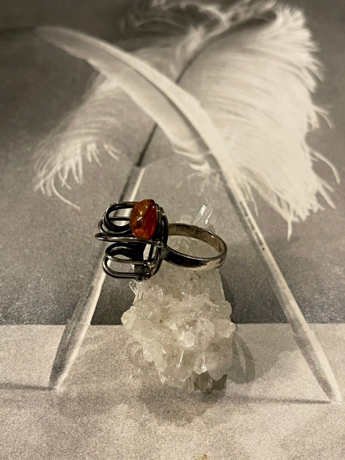 球体の琥珀と立体的な毒蜘蛛のモチーフのヴィンテージリングをご紹介致します。