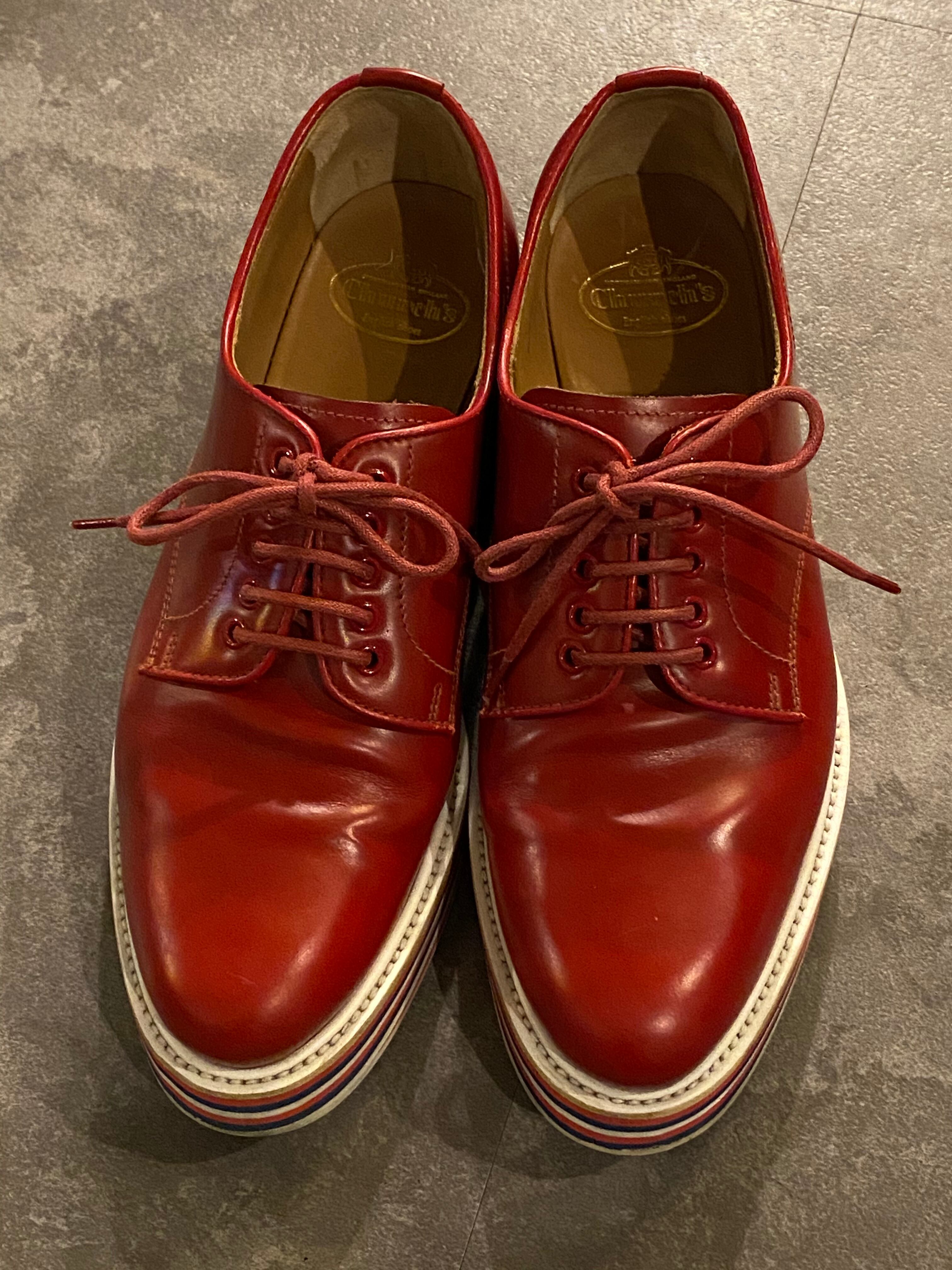 今回ご紹介するのはマットな赤のレザーにスポンジ風な柔らかな厚底のレースアップシューズです。