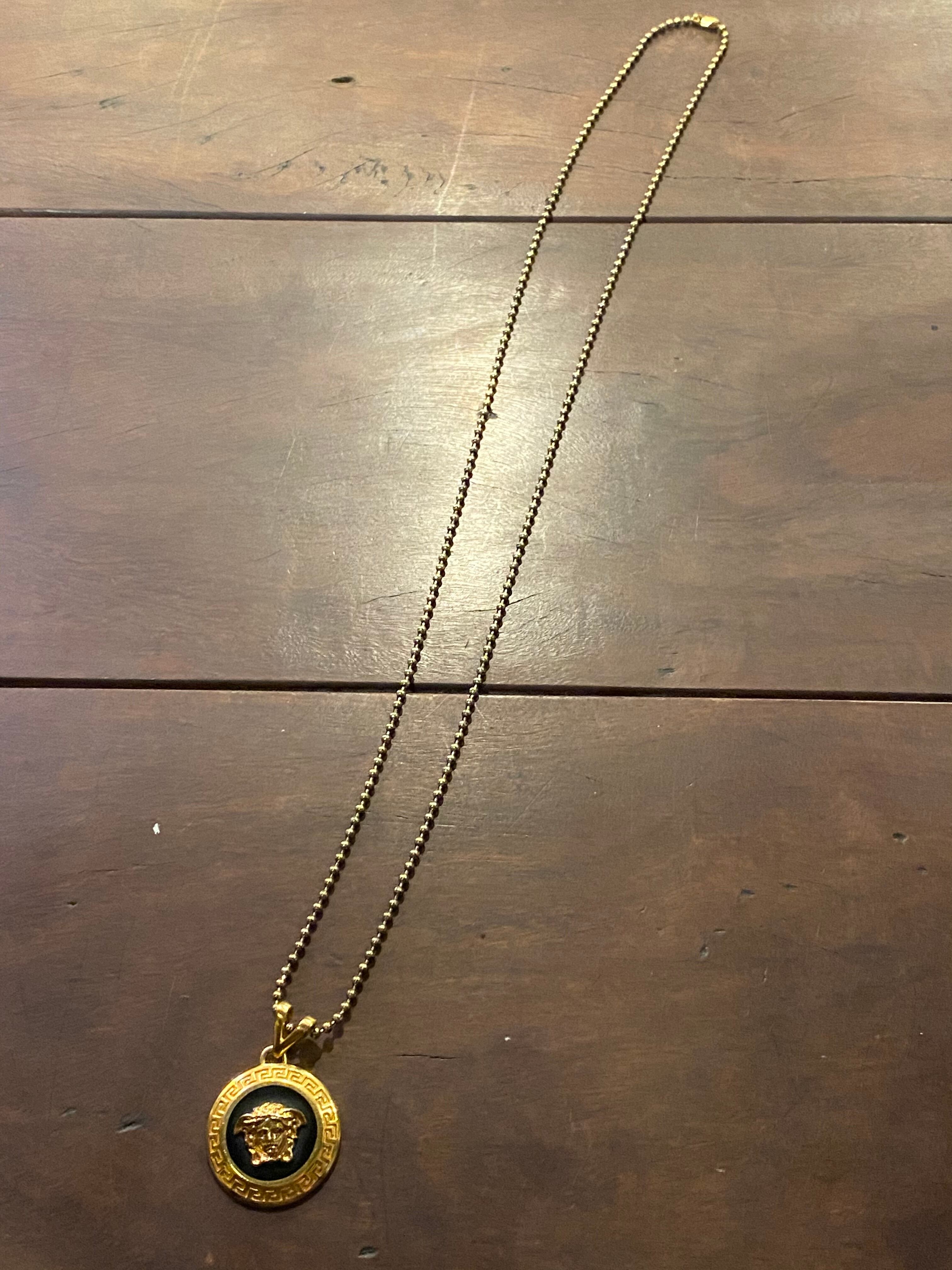 一眼でヴェルサーチとわかるデザインなので、エッジの効いたコーディネートに持ってこいのネックレスです。