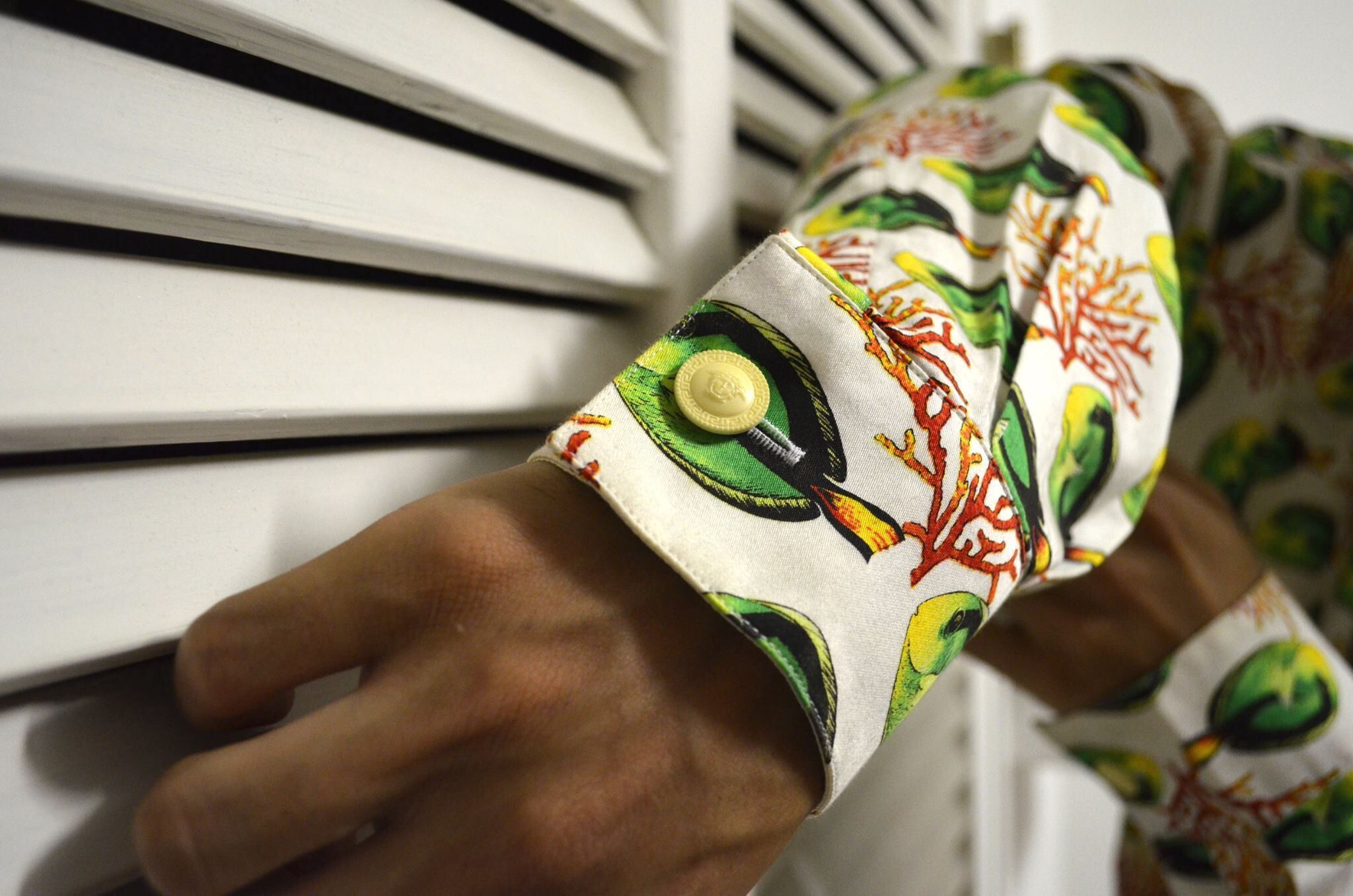 だまし絵のように見える鮮やかな熱帯魚と赤いサンゴ礁がファニーなGIANNI VERSACEのコットンシャツ。長めの着丈や落とした肩位置、パキっとした質感のコットン地がリラックス感のあるバランスのいい一着。