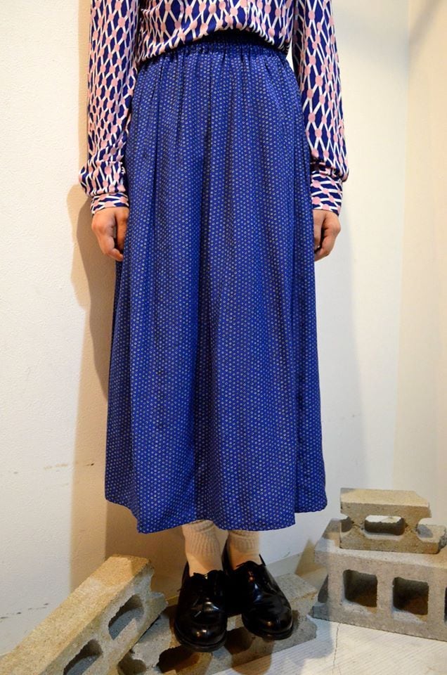 インクブルーに手書き風のタッチでプリントされたドットが愛らしいロングスカート。レーヨン素材の軽快に揺れる柔らかい質感と、程よい野暮ったさがヨーロッパの田舎娘のようなナチュラルな可愛さを引き立ててくれます。