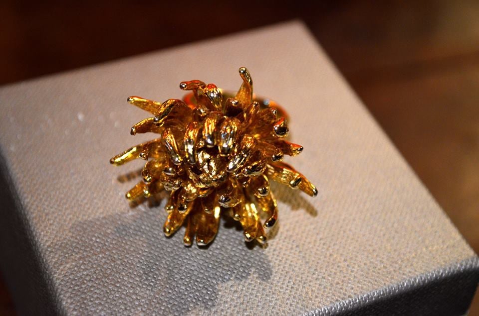 存在感溢れる大振りの菊の花を型取り、BRASS素材にゴールドメッキ加工が施された、なんともマックイーンらしいラグジュアリーな逸品。