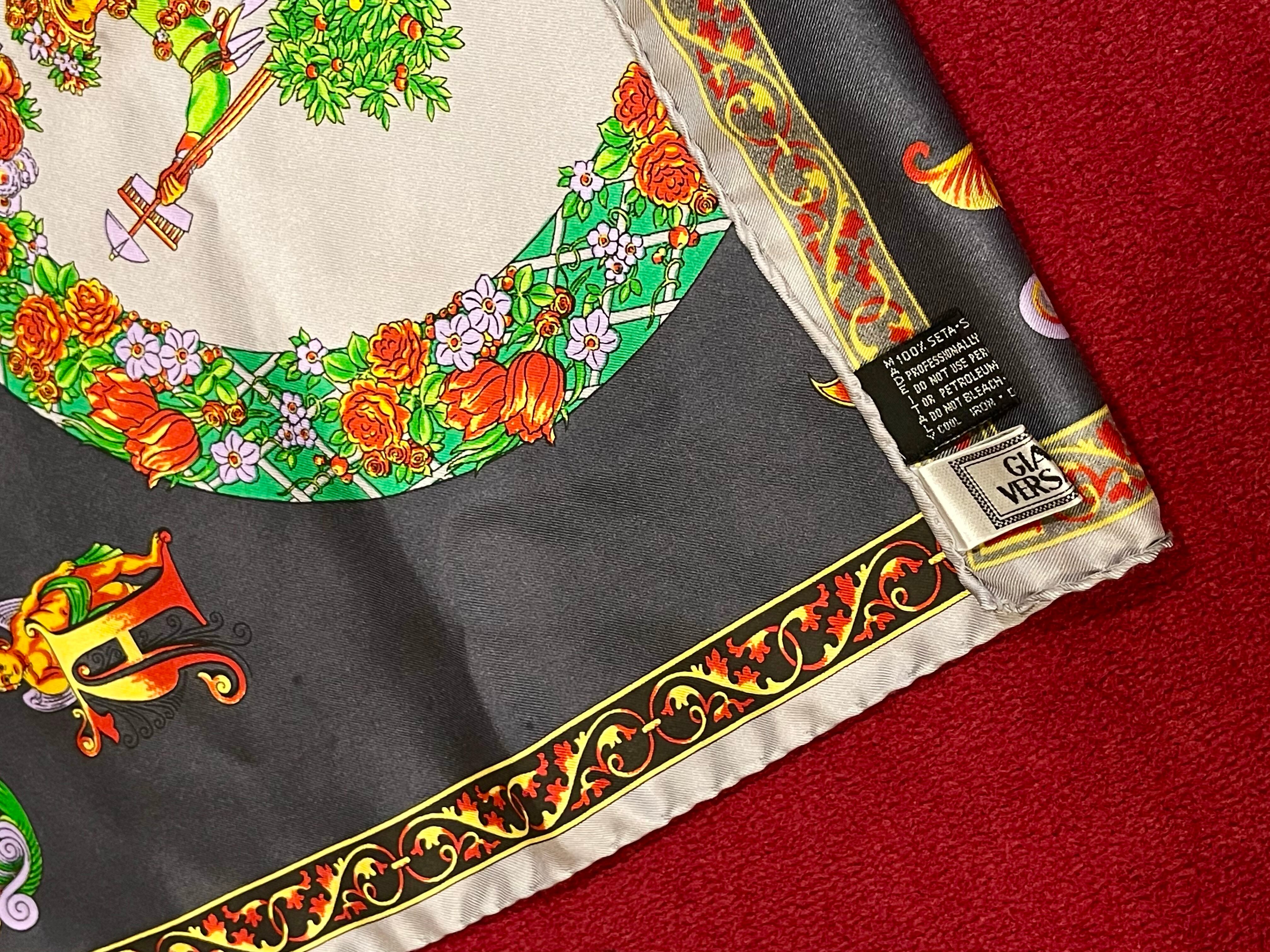 ヴェルサーチより華やかな暖色を用いた総柄のスカーフをご紹介致します。