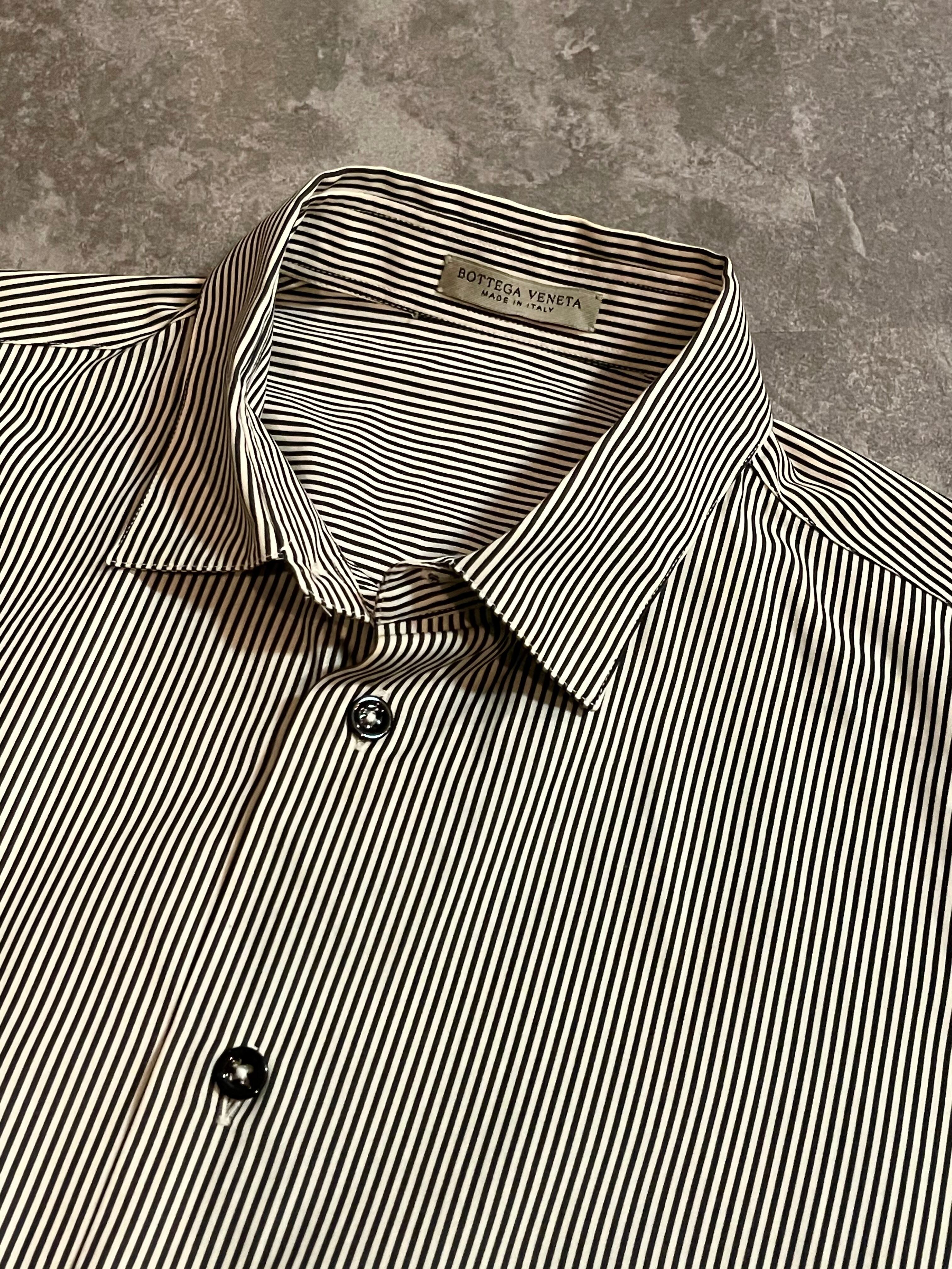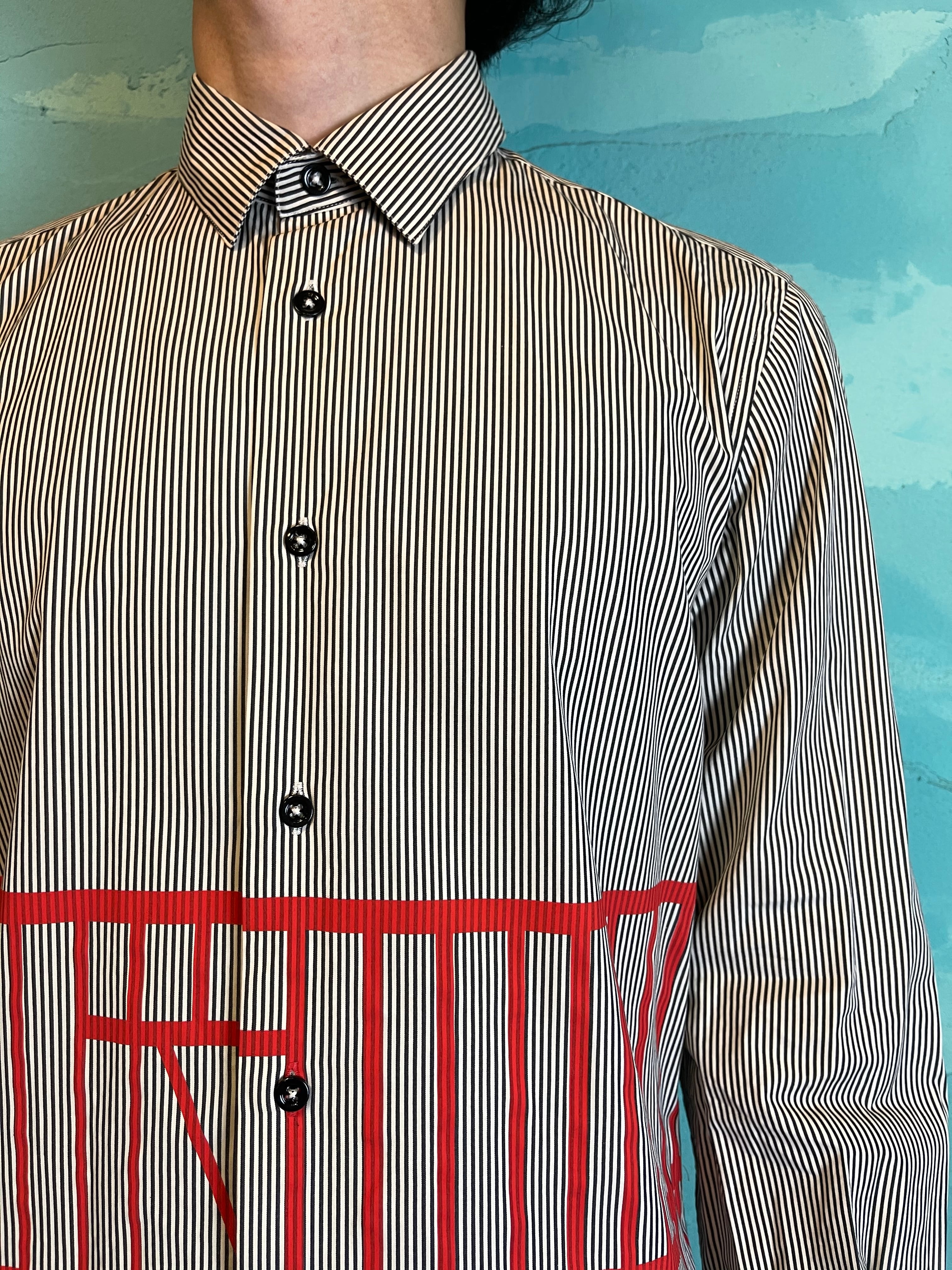 ボッテガヴェネタより、モノトーンのストライプにユニークな赤のラインのプリントが入ったメンズシャツをご紹介致します。