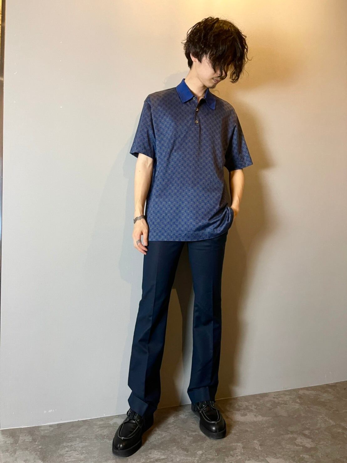ネイビーベースのコットンにブランドアイコンのガンチーニの柄の総柄となっており、ラグジュアリーなテイストながら、ベースはポロシャツなので爽やかに着用できるこちら。