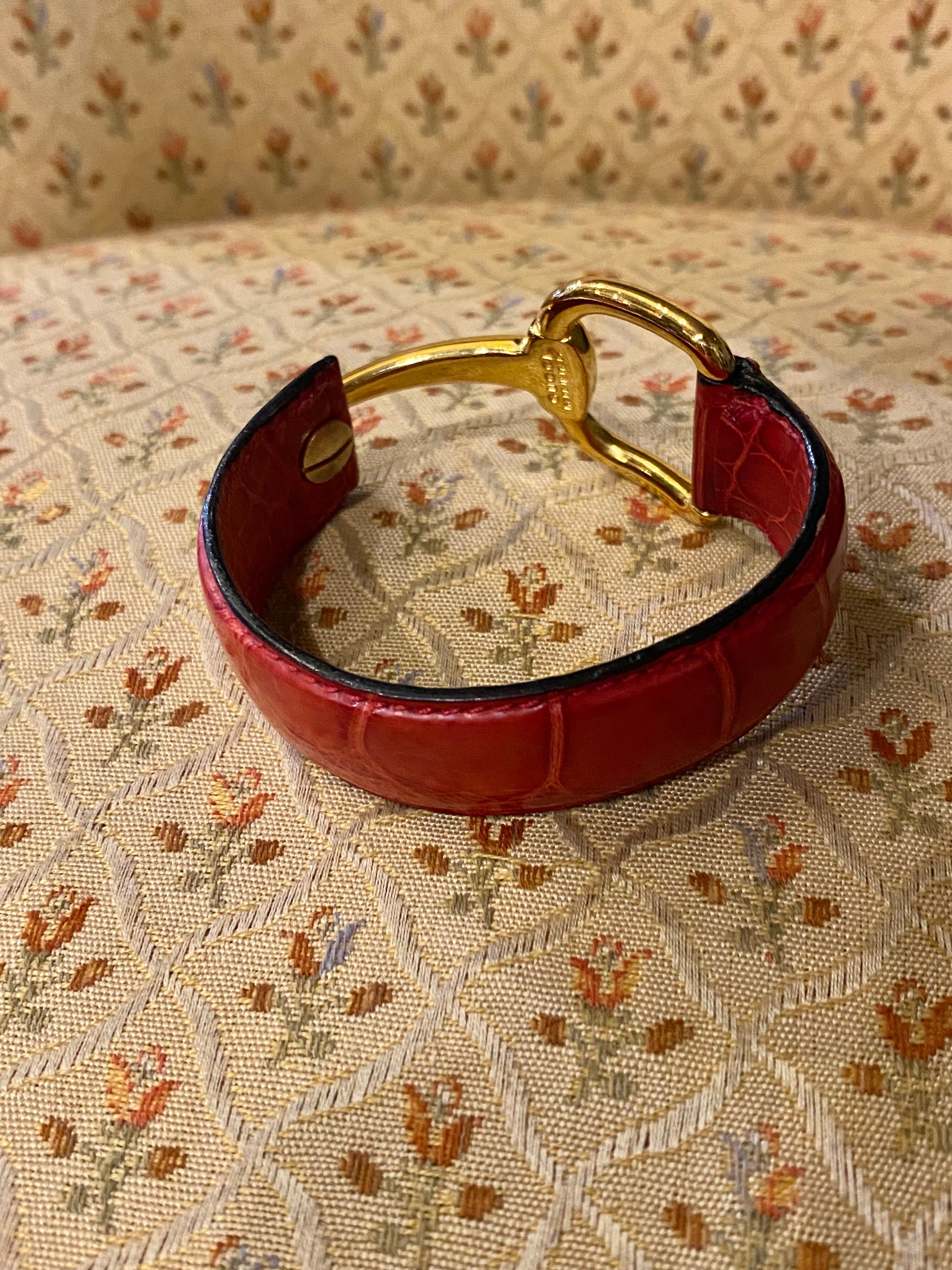 こちらはクロコの型押しの赤のレザーに、イエローゴールドの留め具がホースビットの形となっており、なんともGUCCIらしいエレガントな一点。