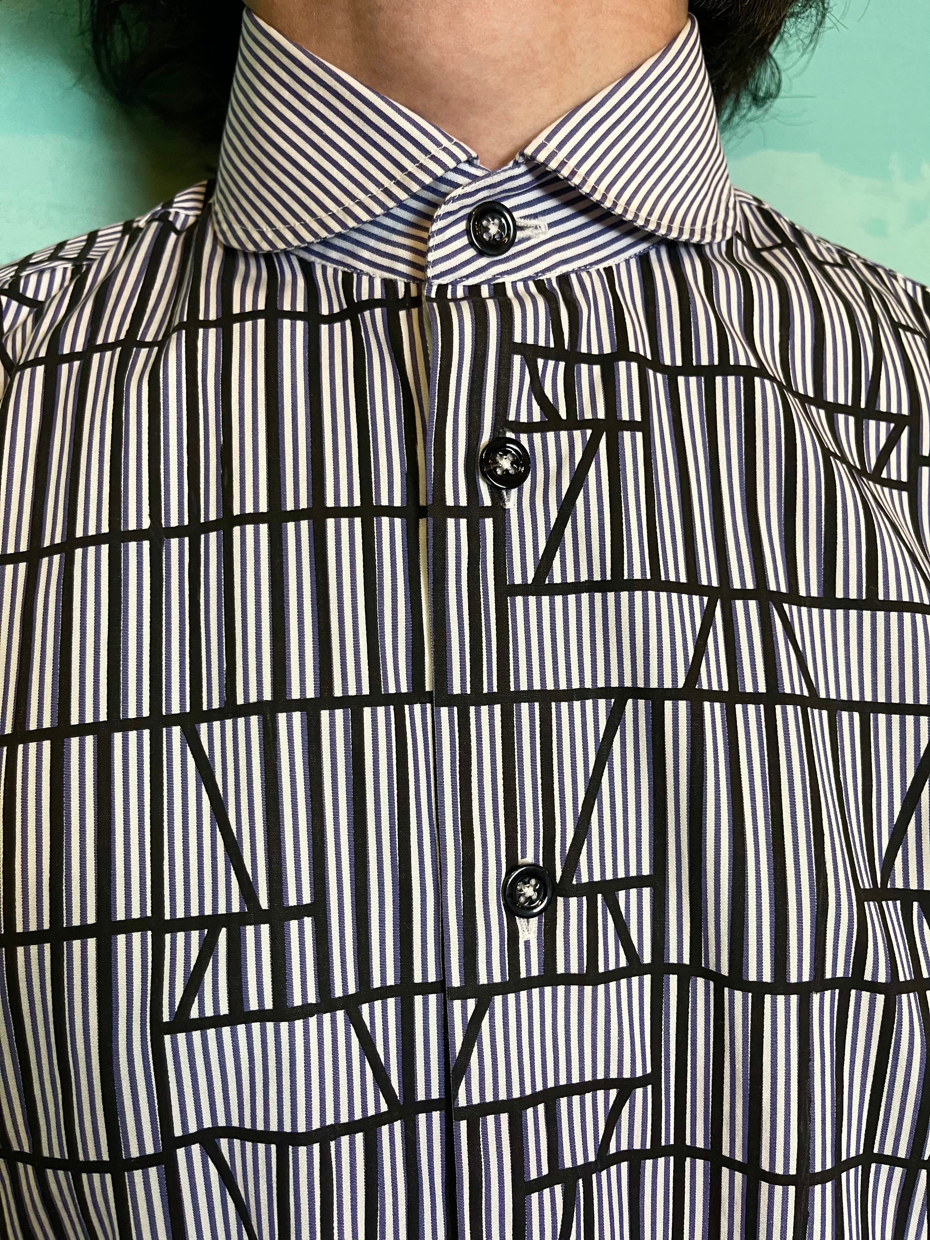 ボッテガヴェネタより、ブルーストライプにアールデコ風のラインプリントが入ったメンズシャツをご紹介致します。