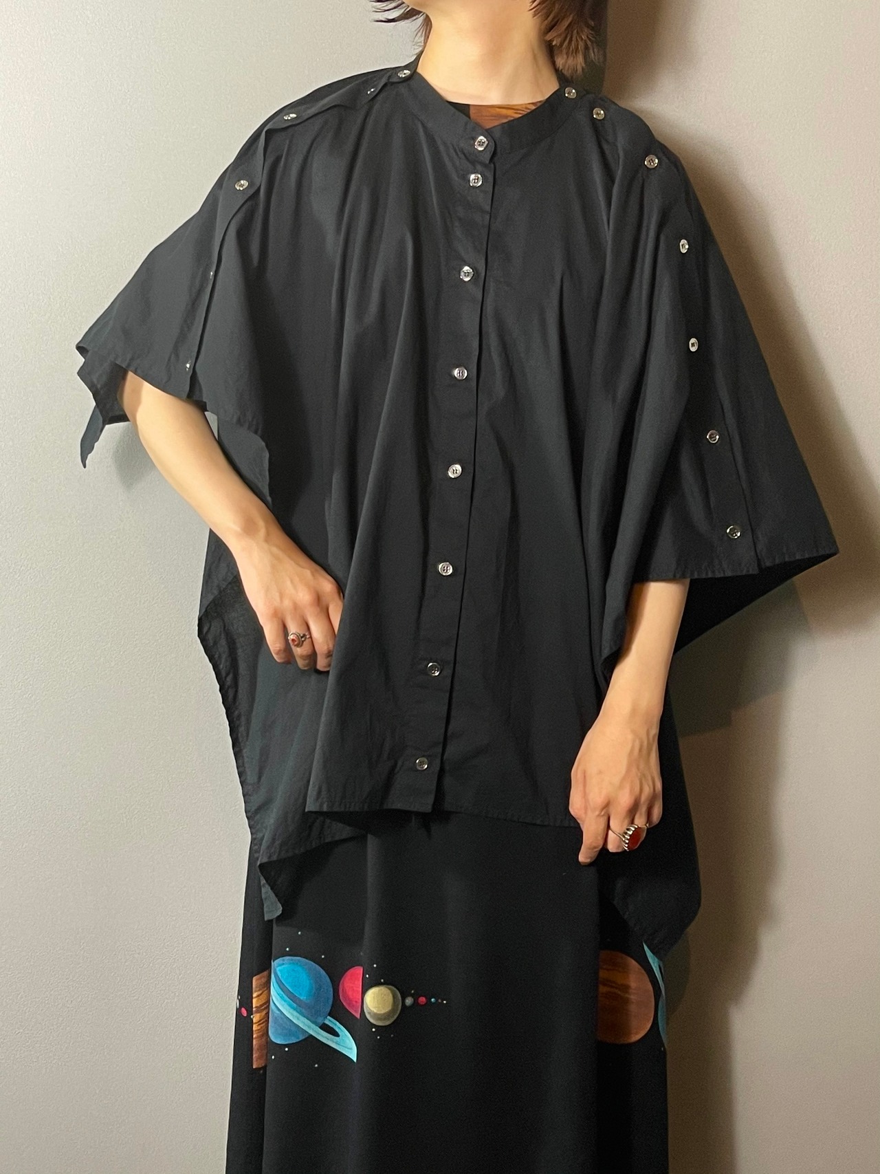 レイヤードに最適で色物や柄物、ワンピースなどポンチョならではならシルエットを活かした個性的なコーディネートが組めるこちら。