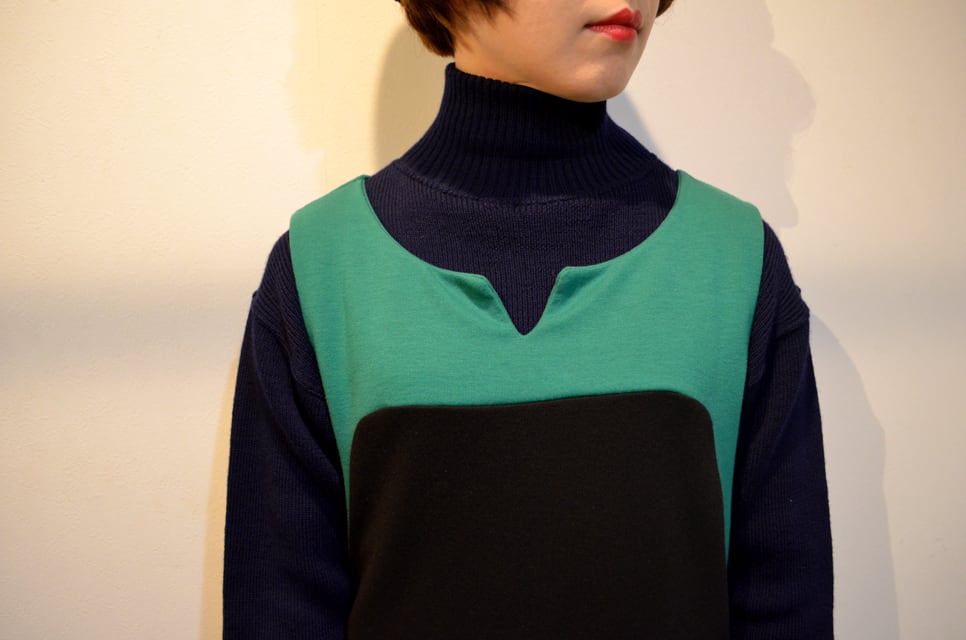 80'sのバイカラーワンピースはEU vintageのもの。ヴィヴィットなブラック×グリーンのレトロポップなカラーミックスとは裏腹に、カットソー生地なので気負いなくデイリーにお召し頂けます。