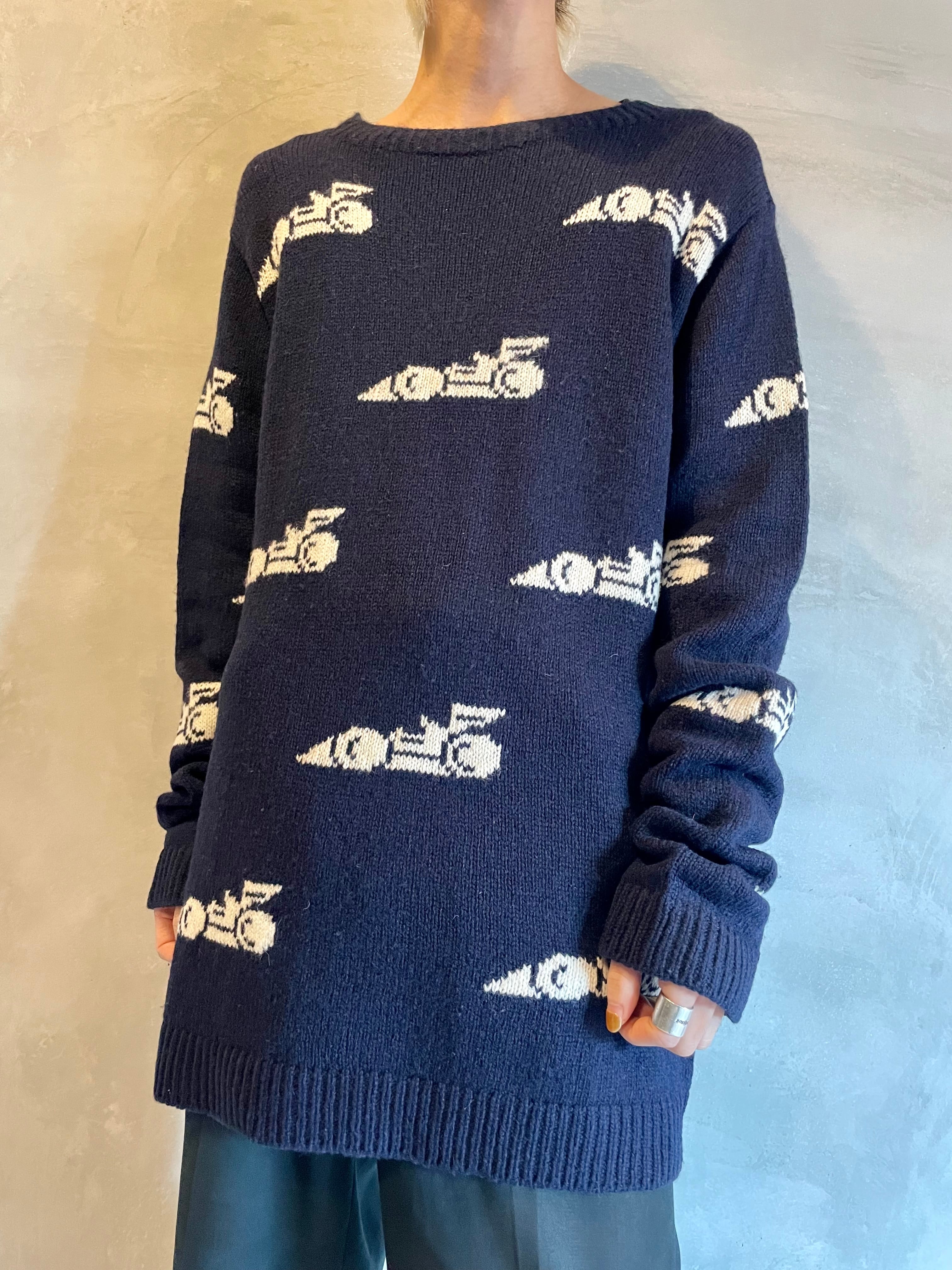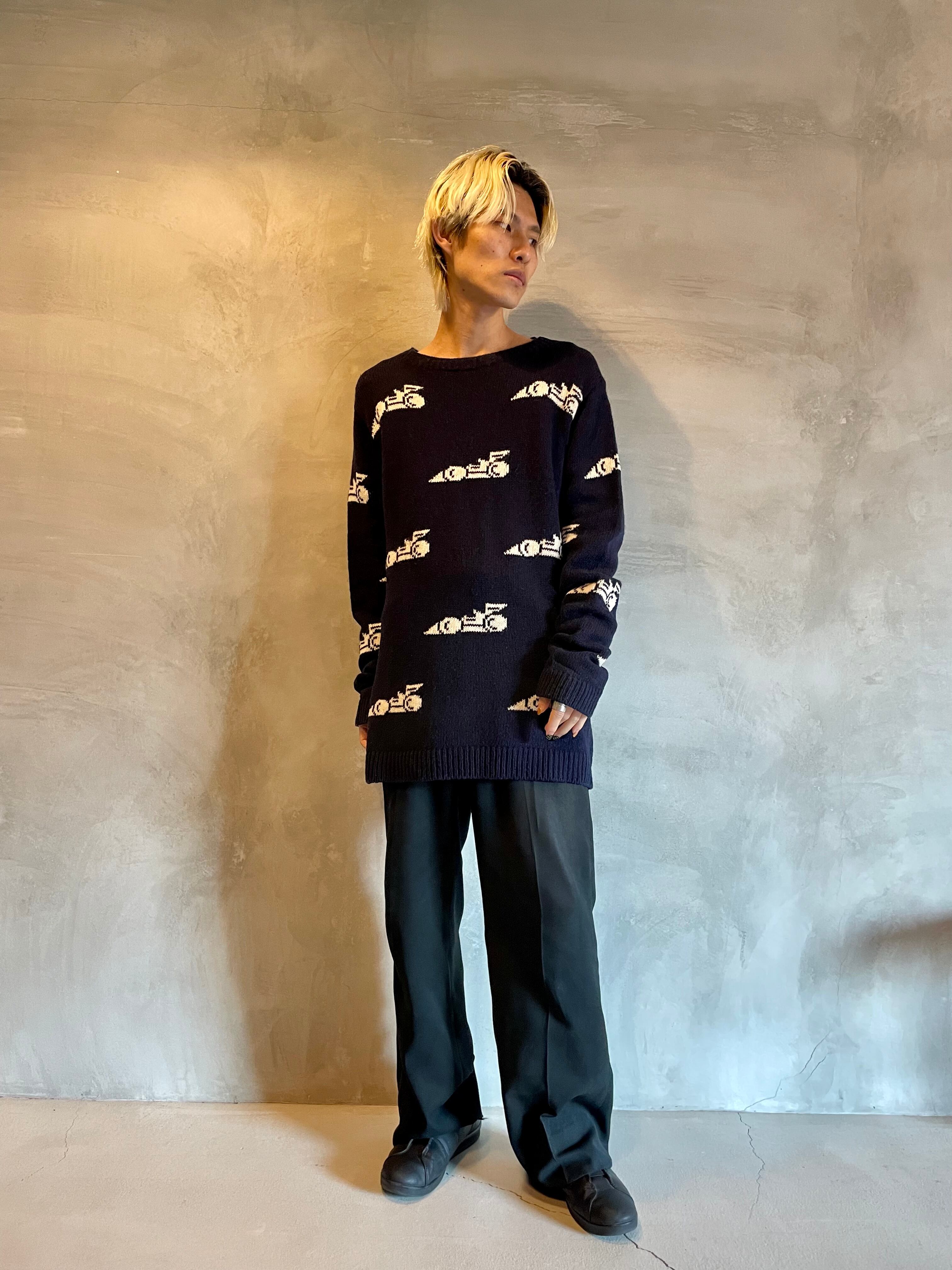 ゆったりとしたシルエットにレーシングカーの総柄のデザインが遊び心のあるモチーフとなっており、編みのゲージも緩過ぎないローゲージがこなれた雰囲気を演出します。