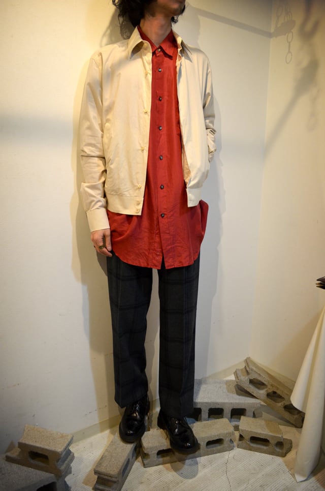 艶めいた光沢感がアンニュイな雰囲気を漂わせるPRADAのポプリンシャツブルゾン。 色気のあるソフトな肌なじみの良いベージュがクラシカルですが、得意の三角襟と仕立ての美しさは右に出るものはいないといえるマニア心を擽るため息の出る逸品。