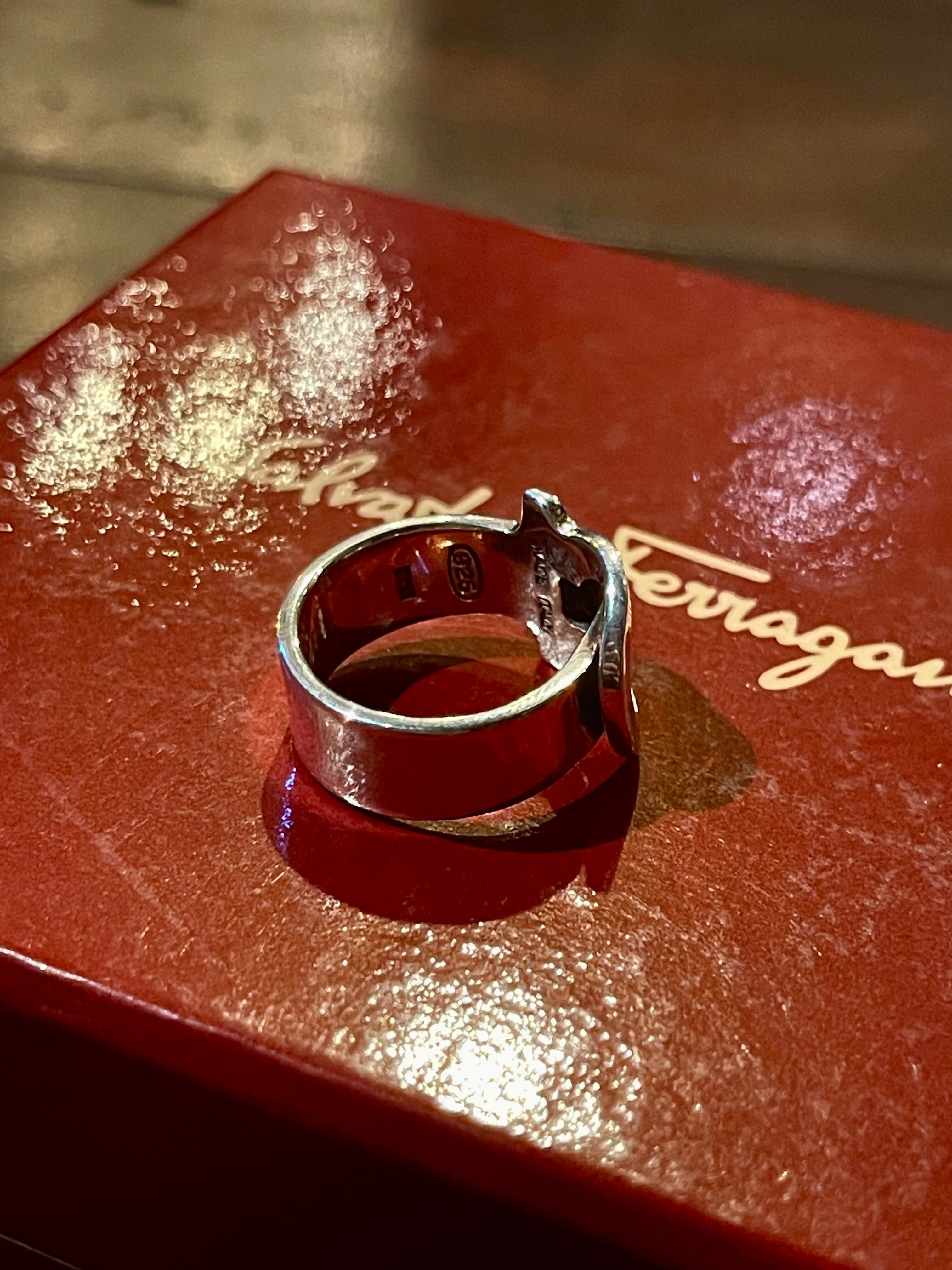 サルヴァトーレ・フェラガモより、長期に渡って愛されているブランドアイコンのガンチーニとロゴをあしらったシルバーリングをご紹介。