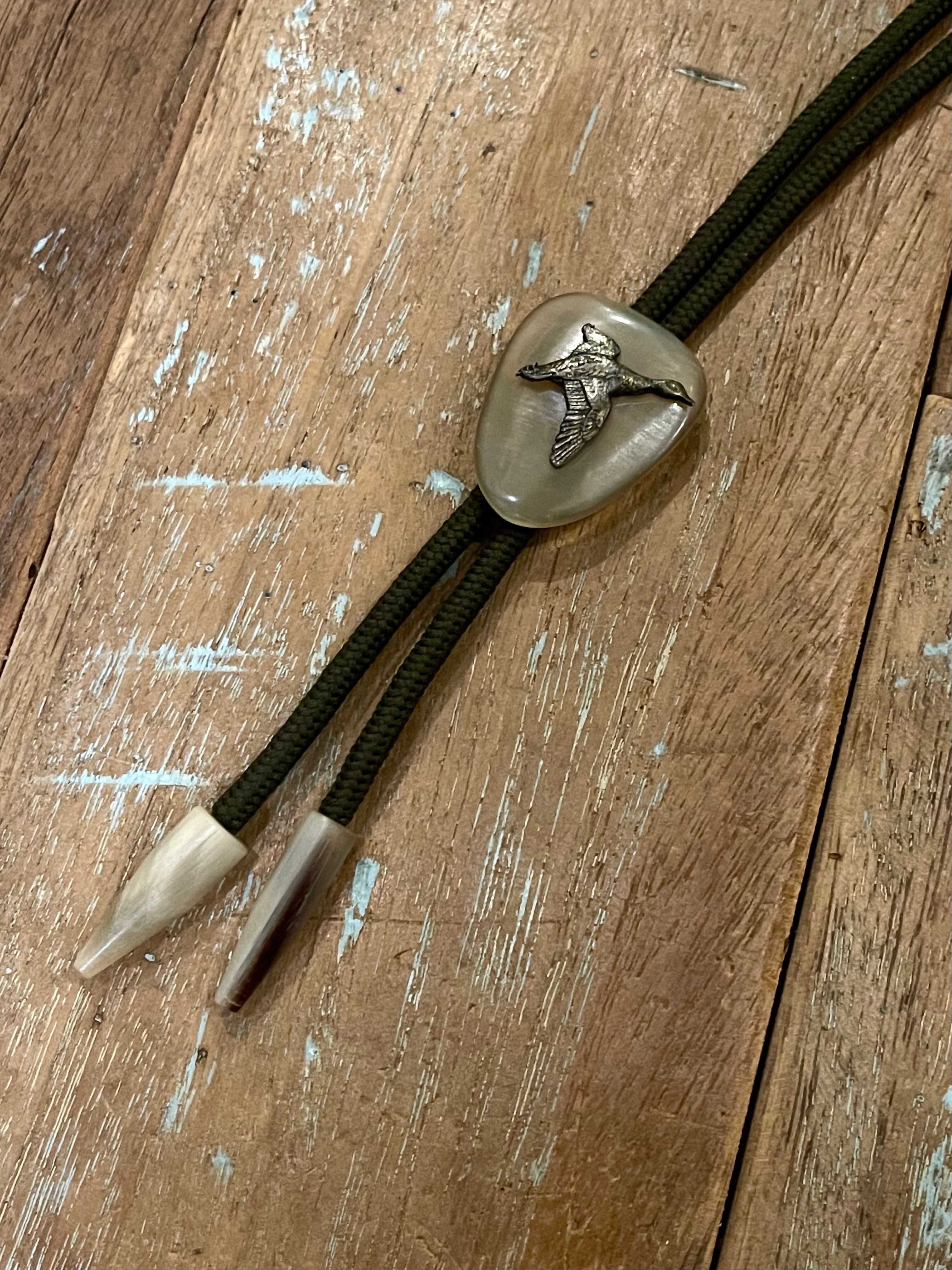 ダークグリーンのロープにアグレットはアイボリーのアクリル樹脂に象牙の様な加工を施した羽ばたく鳥のデザインです。