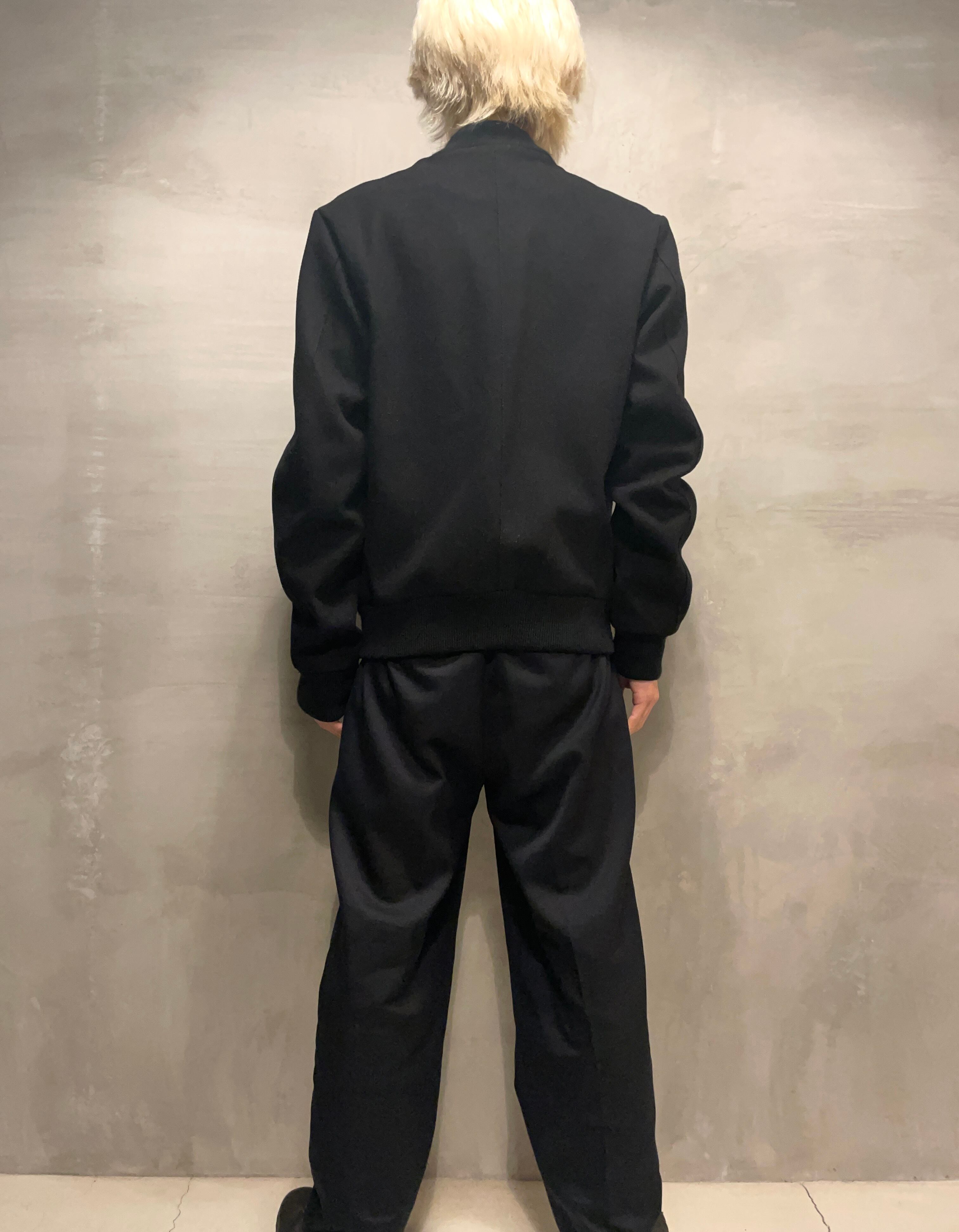 黒のマットな無地とネイビーのケーブルニットのドッキングデザインがユニークで、タイトなショートブルゾンにする事でカジュアルなイメージのケーブルニットを調和しています。