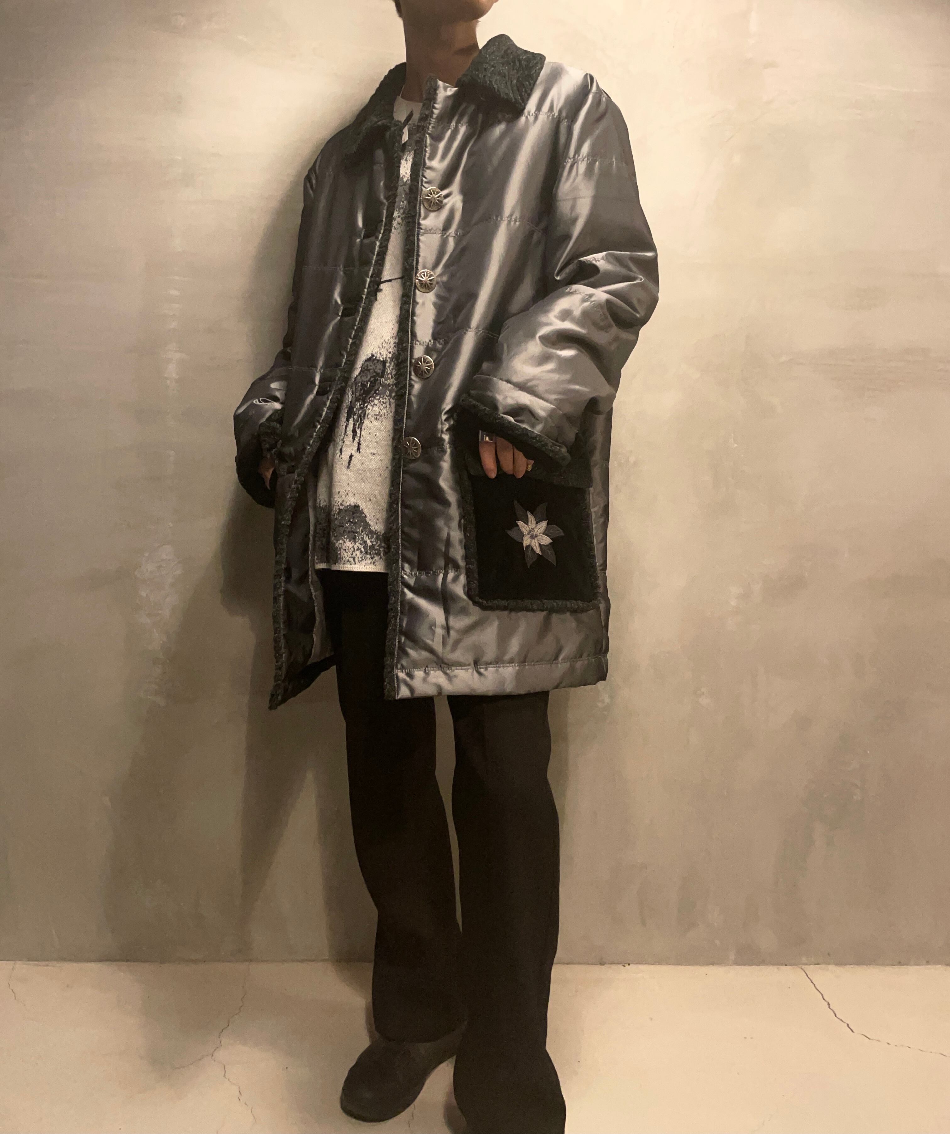 青味のあるグレーカラーに中綿の入った暖かい仕様でフラップポケットにはエーデルワイスの刺繍やボタンもエーデルワイスのモチーフが入っており、カントリーでノスタルジーなニュアンスを演出しています。