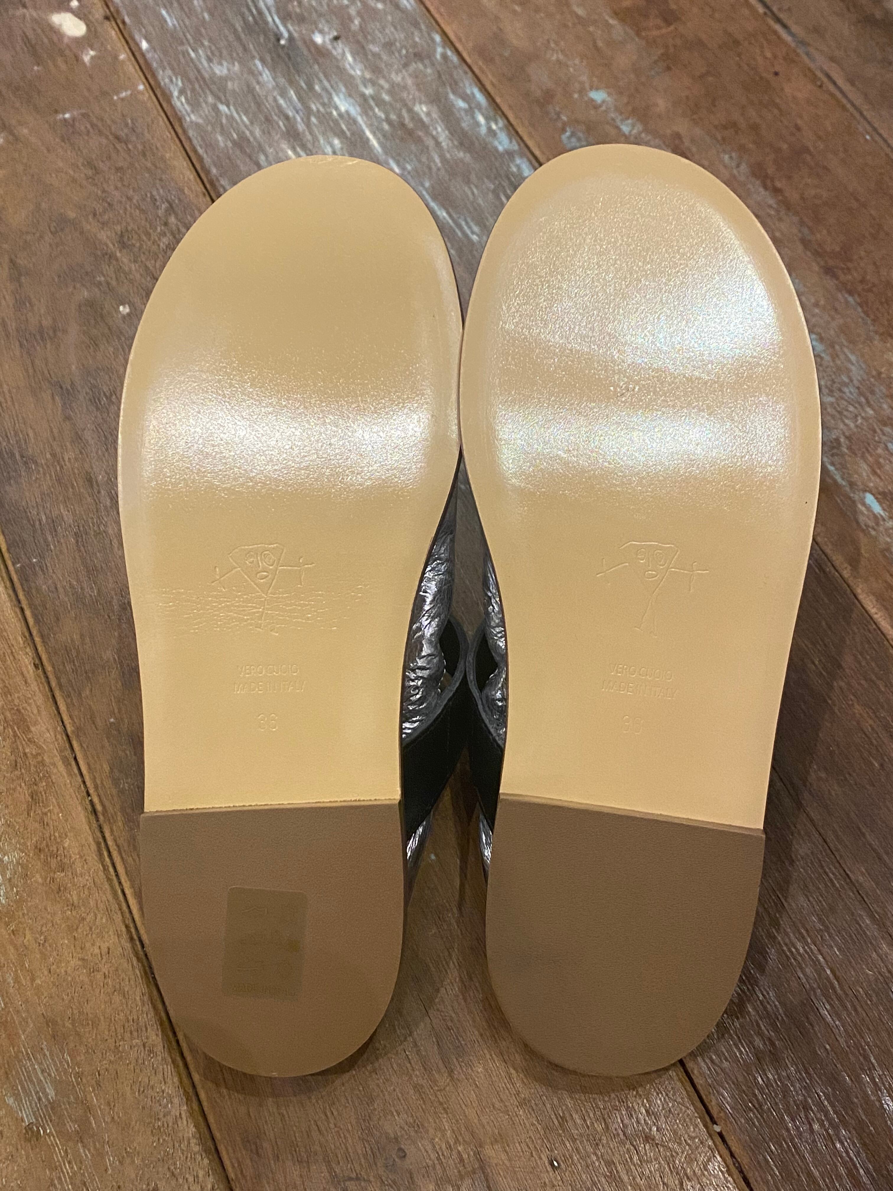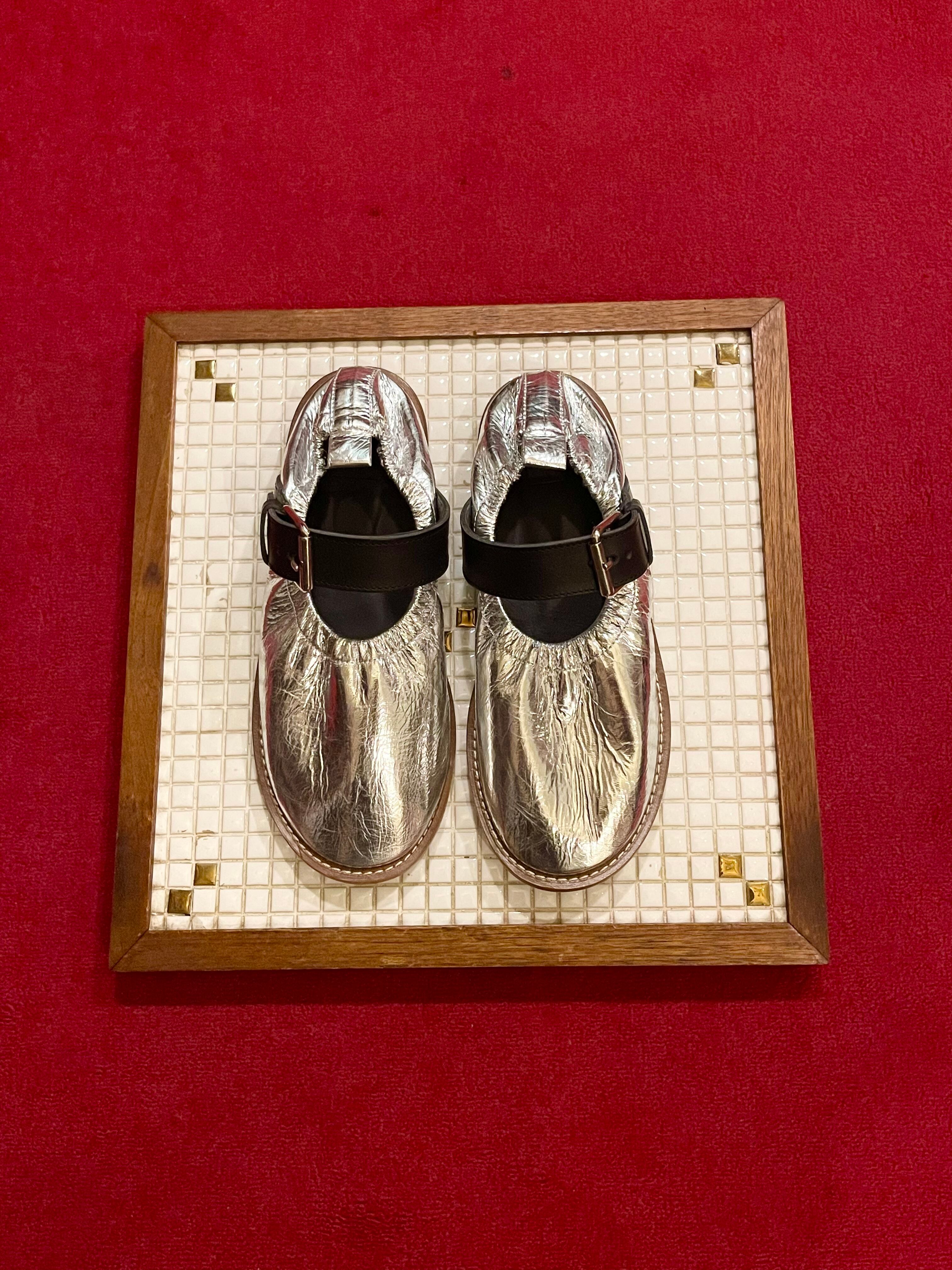 メタリックなシルバーに黒のベルトのフラットシューズで、ギャザーを寄せたバレエシューズのような履き口に、トゥの丸みがカスティリオーニ氏のデザインを彷彿とさせる様なデザインです。