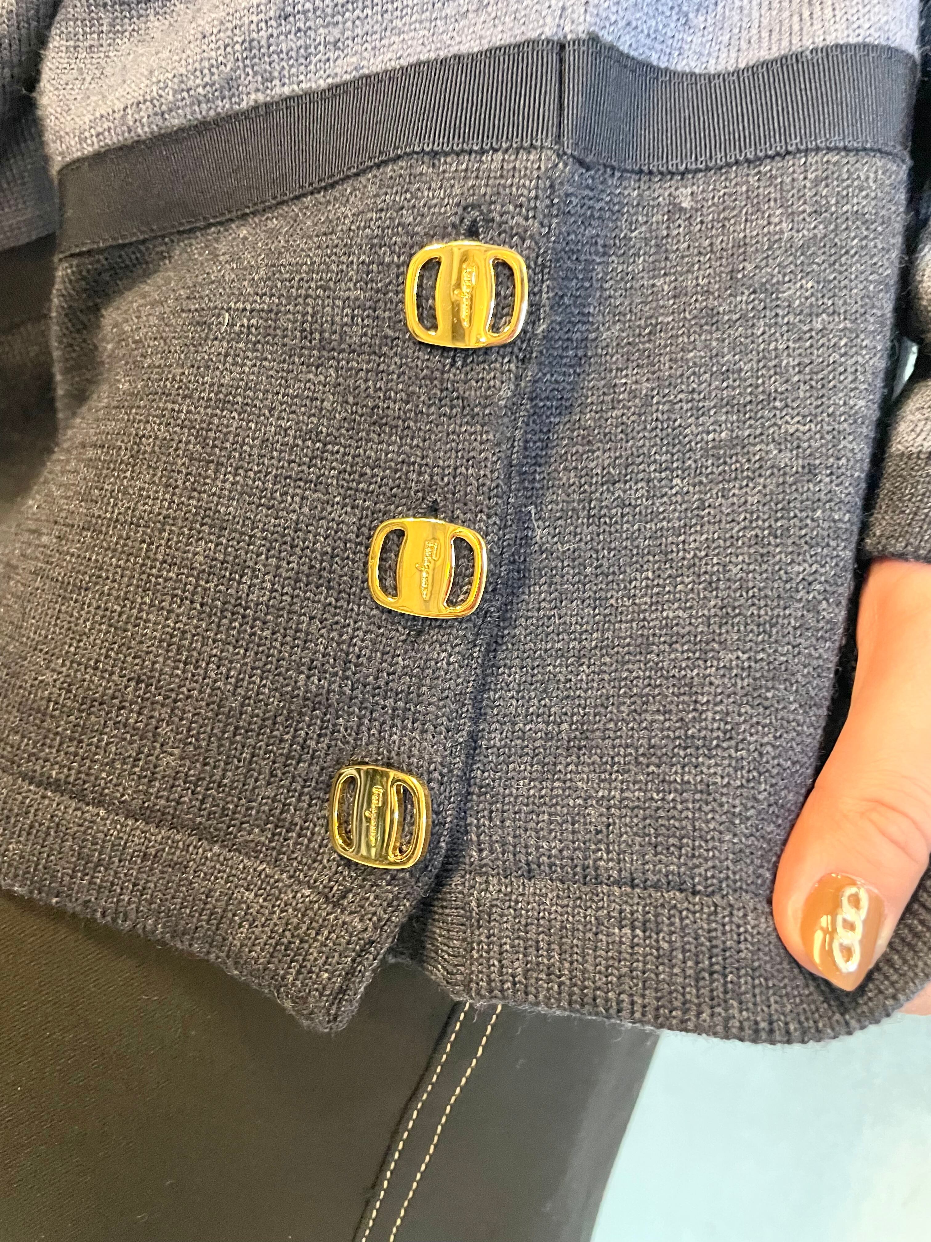 ニットの切り替え部分にはグログランテープが使用されており、フェラガモは元々このグログランテープを製造する会社であり、現在も尚洋服やバッグに使用されています。