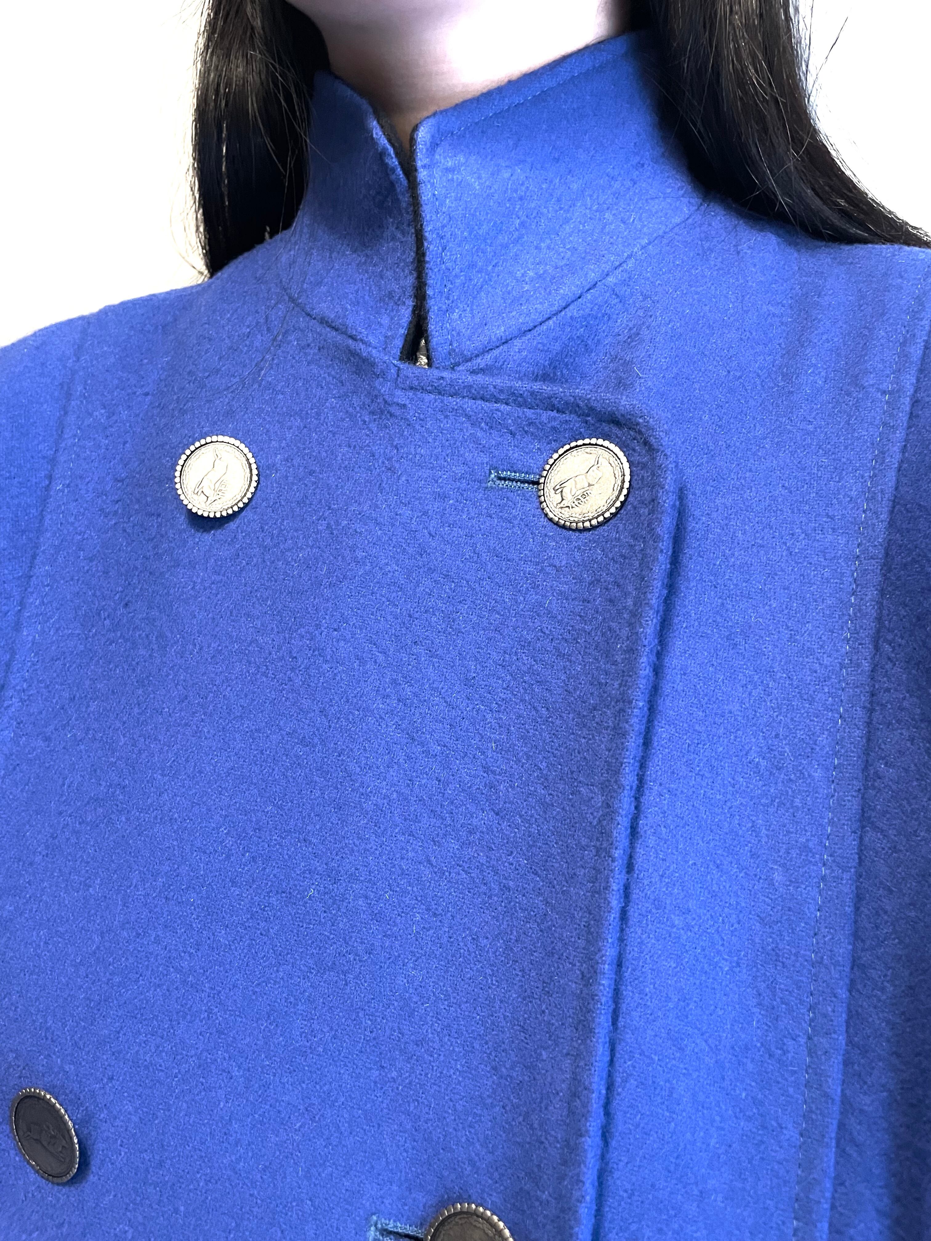 鮮やかなブルーカラーでスタンドカラーと丈の長さがマッチしており、モード感漂うデザインが特徴的です。