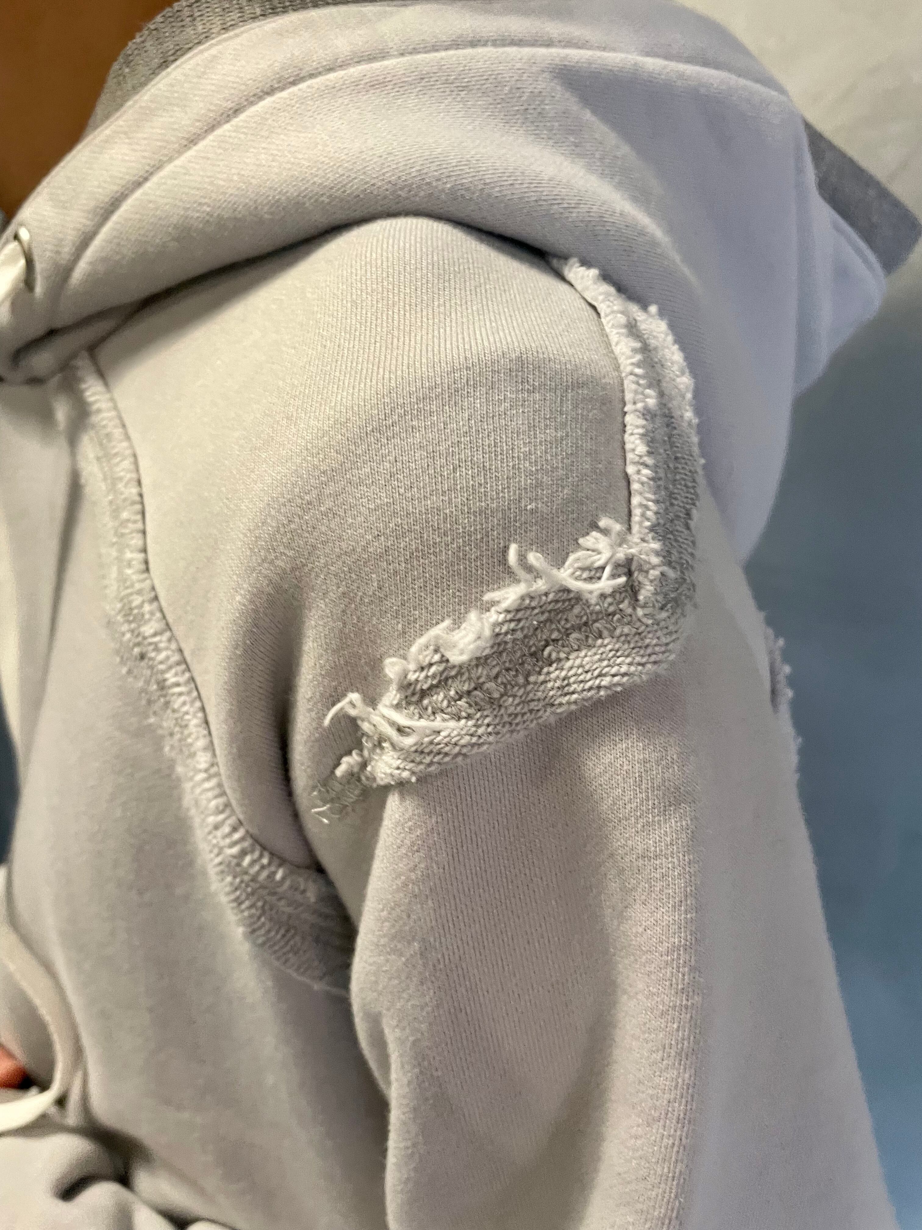 ライトグレーベースのバイカラーに、切りっぱなしやパッチワーク風なディテールを多く使用していますが、着用してみるとスッキリとしたスタイリッシュな印象です。
