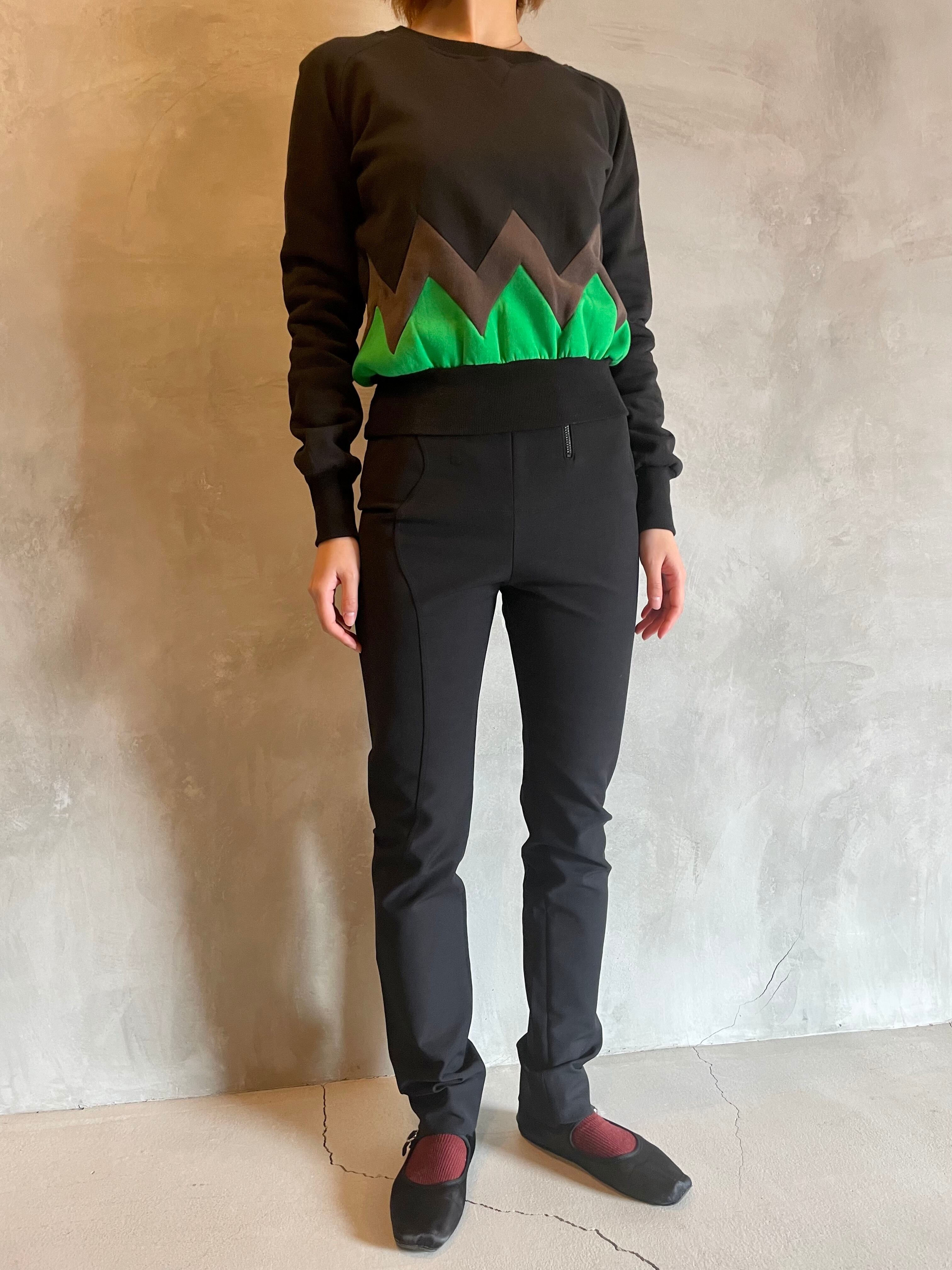 グリーンとブラウンの切り替えのデザインポイントは正にトレンドのカラーバランスで、着丈も短く新鮮な印象に。