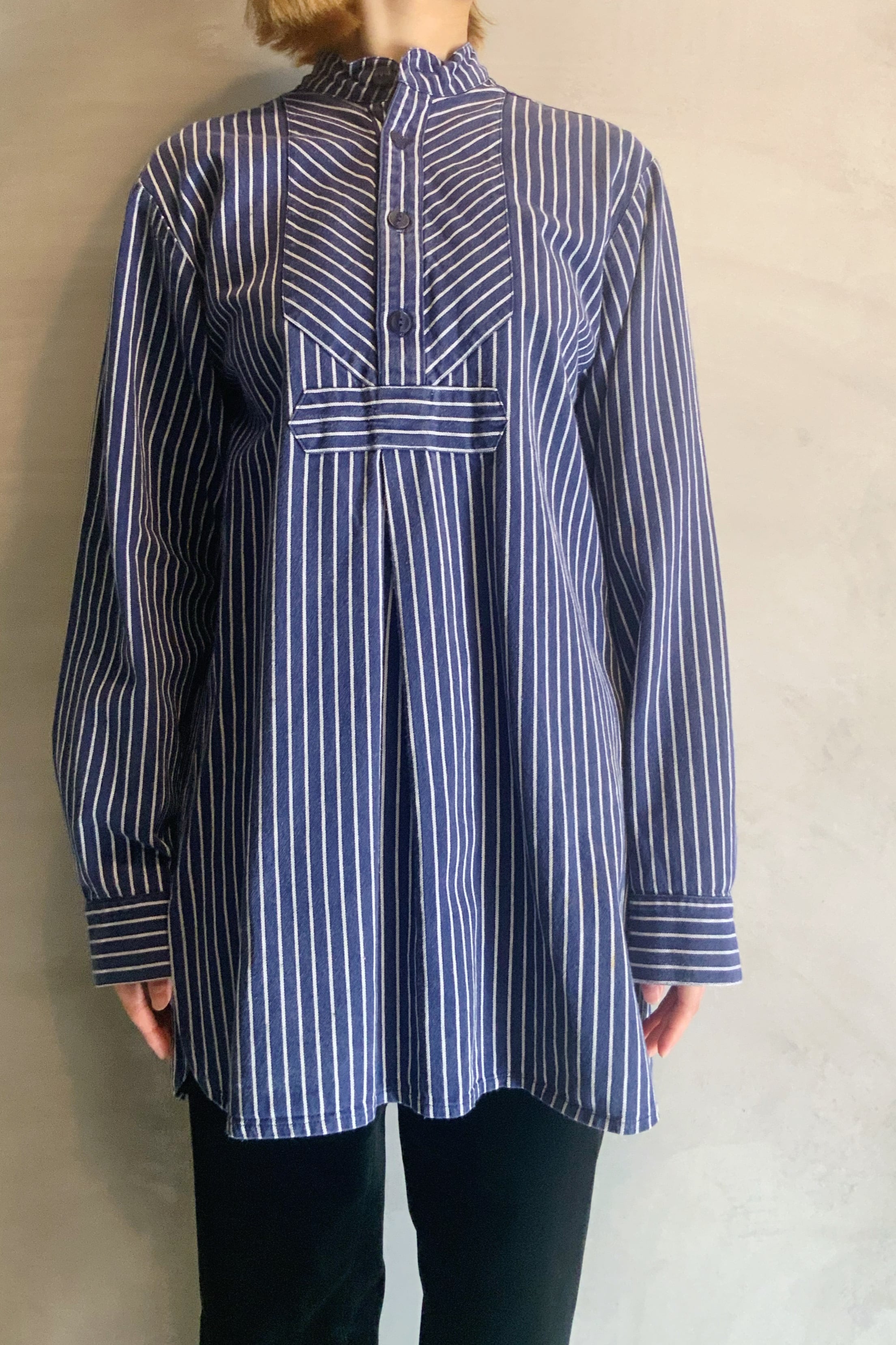 フィッシャーマンシャツと言えば、ネイビーとホワイトのマリンカラーストライプにスタンドカラー。そしてプルオーバーのシルエットと特徴的なデザインになっており、近年のプルオーバーシャツのトレンドの大元と言われております。