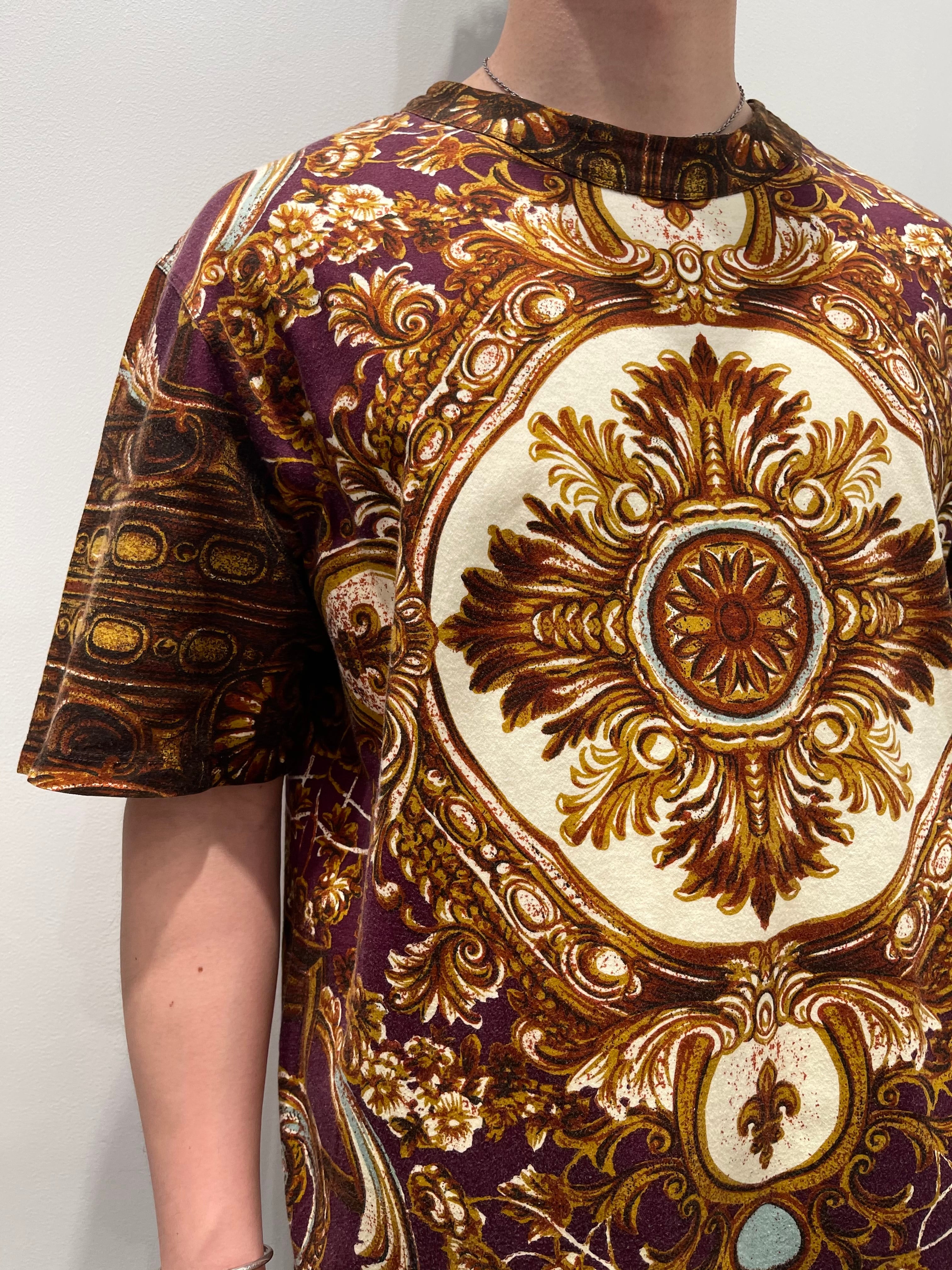 ゴルチエを象徴とする優雅なロココ様式柄のモードで高貴なスカーフ柄が一面にプリントされており、少し霞んだ奥行きのある配色でアンティーク感のある存在抜群のギラフィックです。