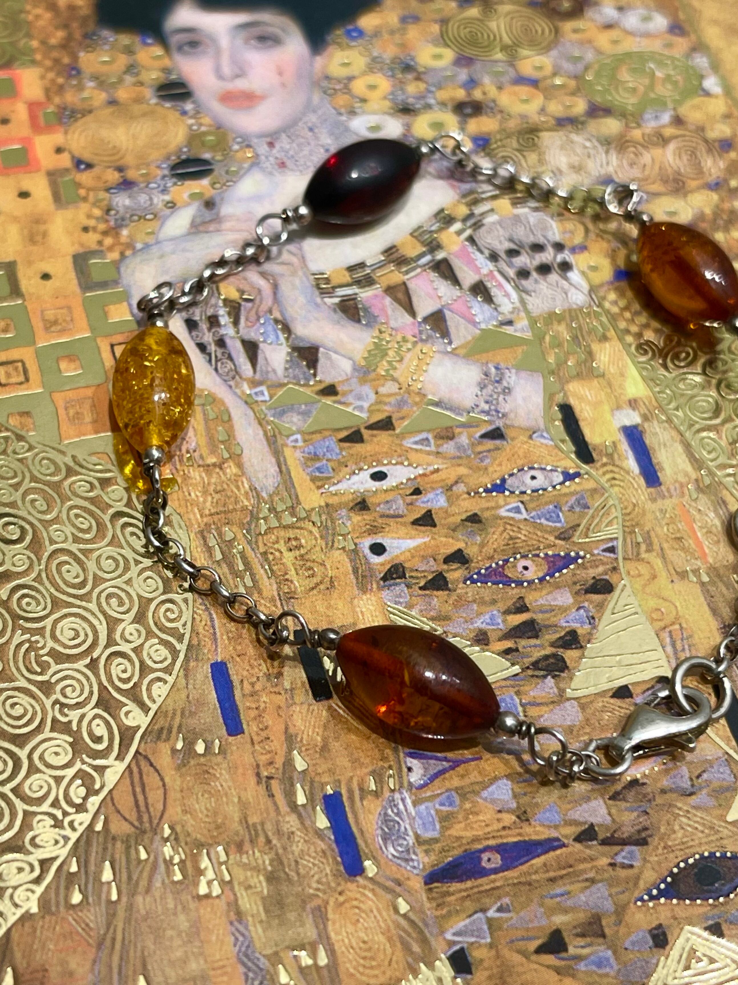 イエロー ブラウン ダークブラウンの3色の琥珀がパーツになっており、色の濃いモノはチェリーアンバーやコニャックアンバーなどと呼ばれております。