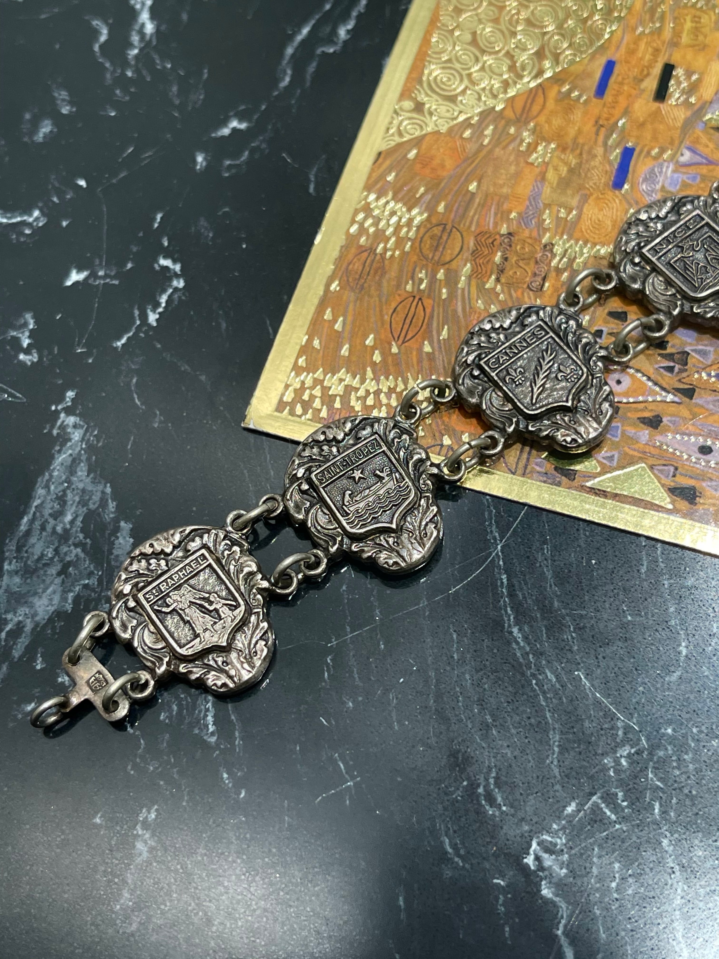 40年代以降 、フランスのお土産として数多く生産されていた建築物やエンブレムをモチーフとしたブレスレット。フランスの都市のモナコなどの紋章が繊細に描かれ連なっております。